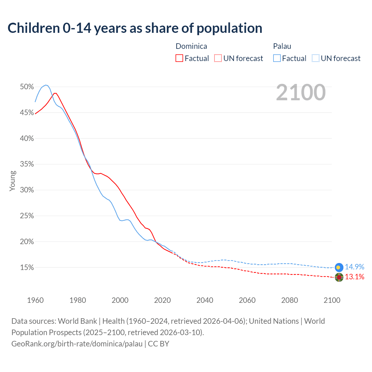 According to the latest available data on birth rates, the fertility rate in Dominica was 1.48 children per woman in 2023, compared to 1.91 in Palau in 2023. The replacement level is considered to be 2.1 children per woman.