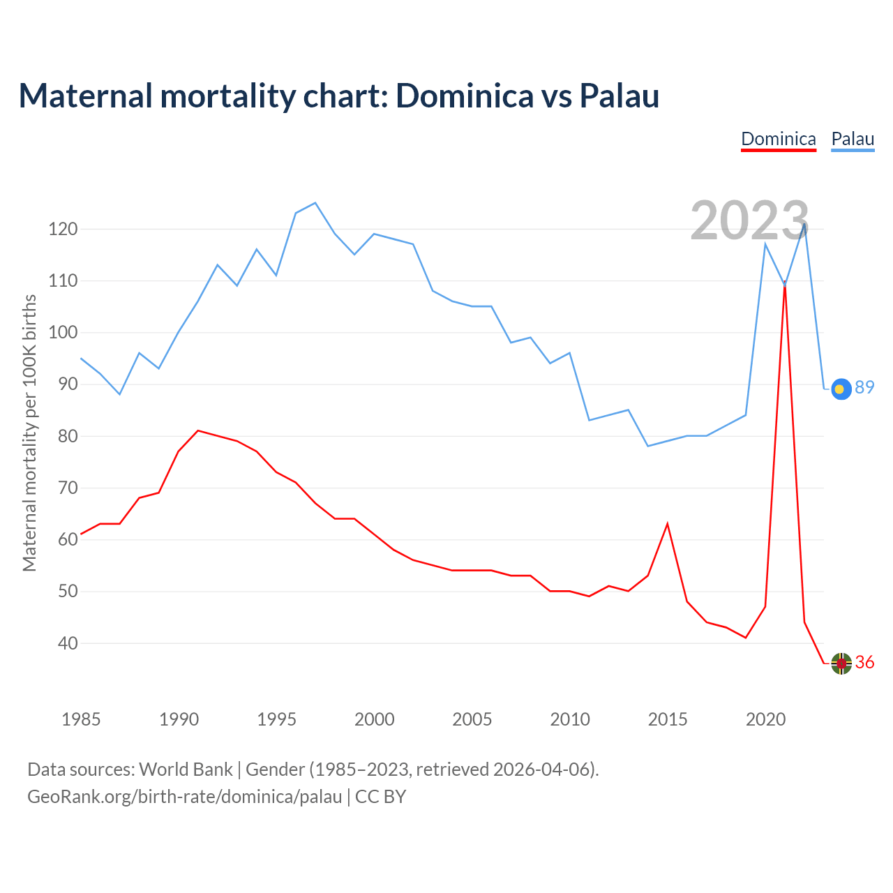The maternal mortality rate, which is the probability of dying during childbirth or within 42 days of pregnancy termination, is 36 deaths per 100,000 live births in Dominica, compared to 89 deaths in Palau.