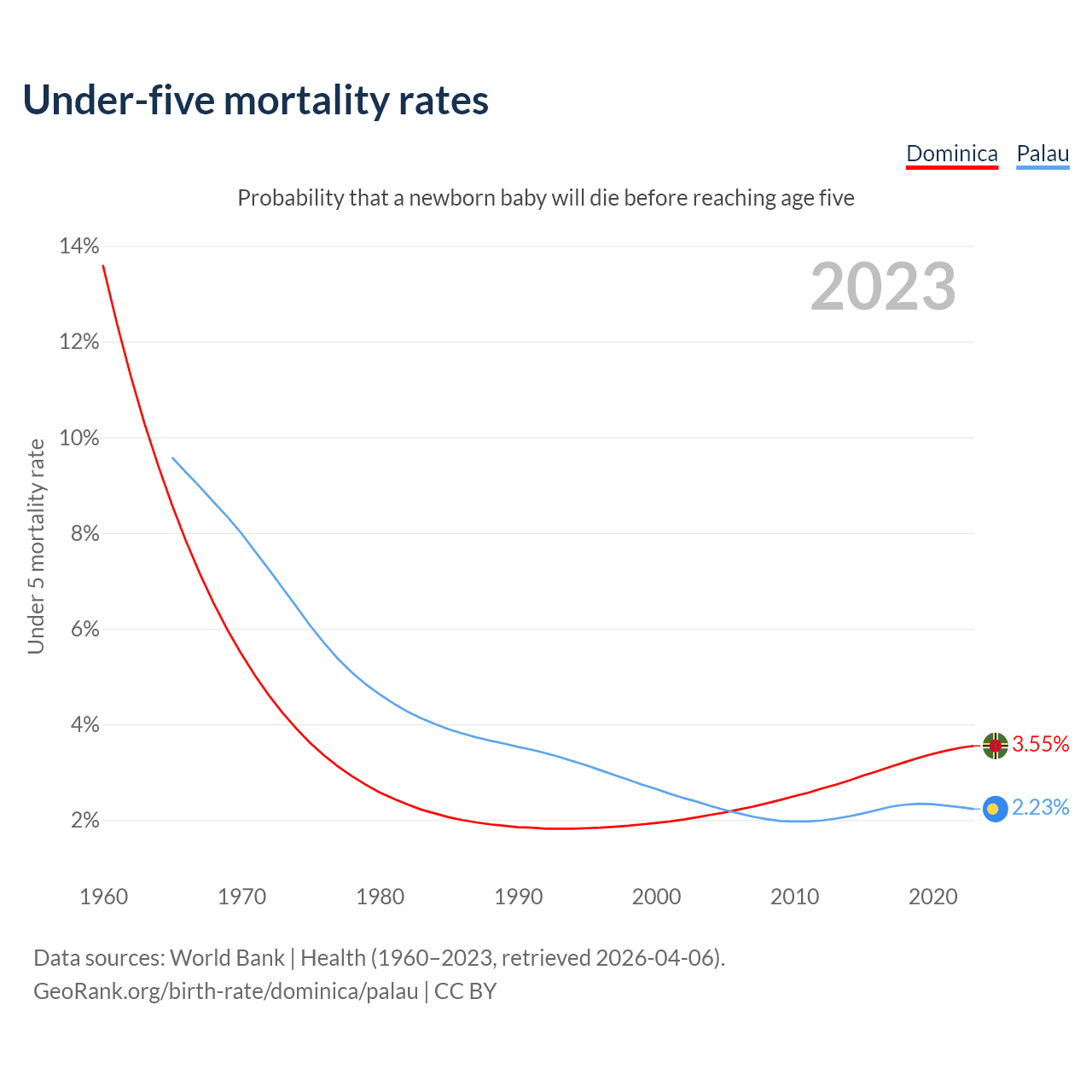 The chance that a newborn baby will die before reaching age five is 3.55% in Dominica and 2.23% in Palau. Above is a chart with historical data on under-five mortality rates.
