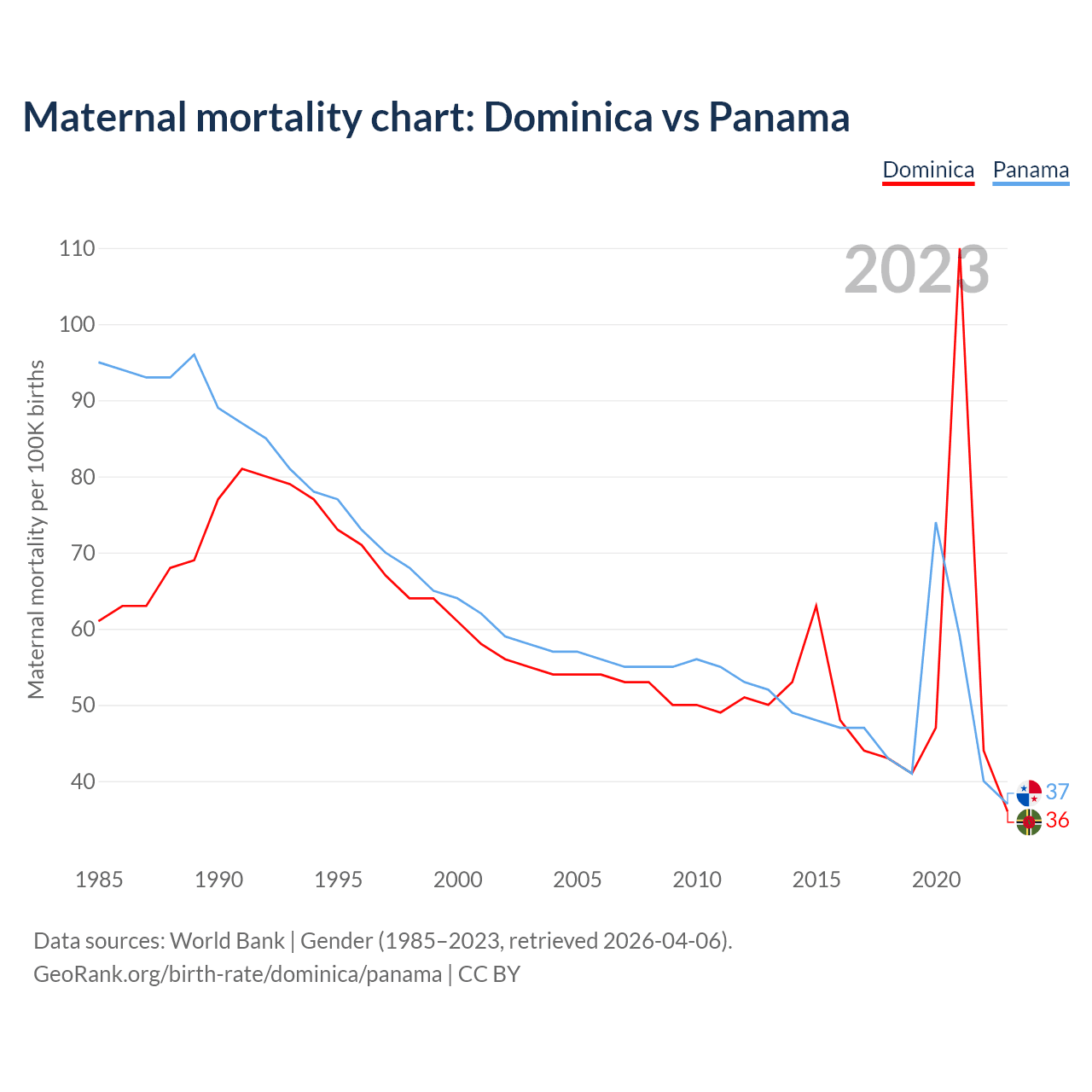 The maternal mortality rate, which is the probability of dying during childbirth or within 42 days of pregnancy termination, is 36 deaths per 100,000 live births in Dominica, compared to 37 deaths in Panama.