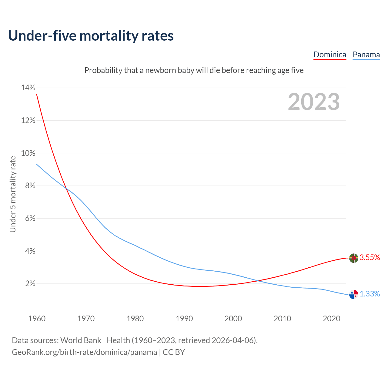 The chance that a newborn baby will die before reaching age five is 3.55% in Dominica and 1.33% in Panama. Above is a chart with historical data on under-five mortality rates.