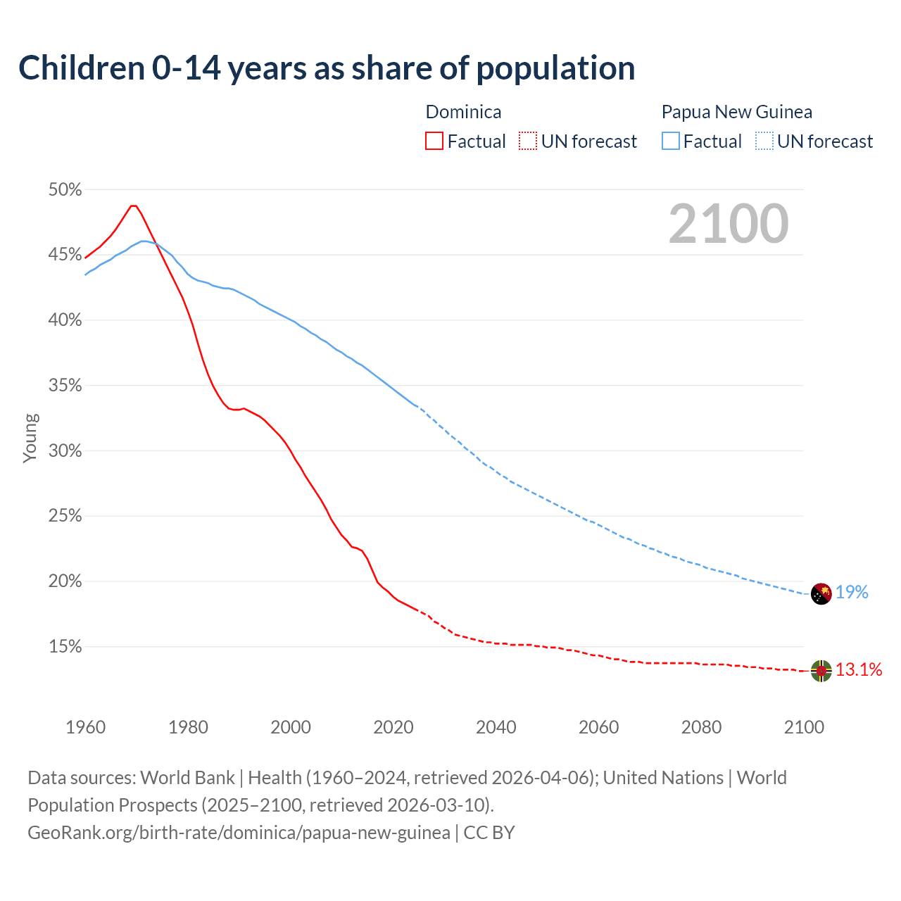 Dominica has an annual birth rate of 11.1 births per 1,000 people, compared to 24.6 for Papua New Guinea. The average number of children a woman is expected to have during her lifetime — the fertility rate, is 1.48 in Dominica and 3.1 in Papua New Guinea — 108.8% difference.