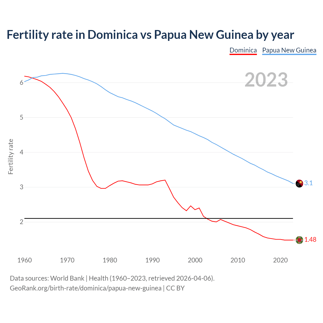 According to the latest available data on birth rates, the fertility rate in Dominica was 1.48 children per woman in 2023, compared to 3.1 in Papua New Guinea in 2023. The replacement level is considered to be 2.1 children per woman.