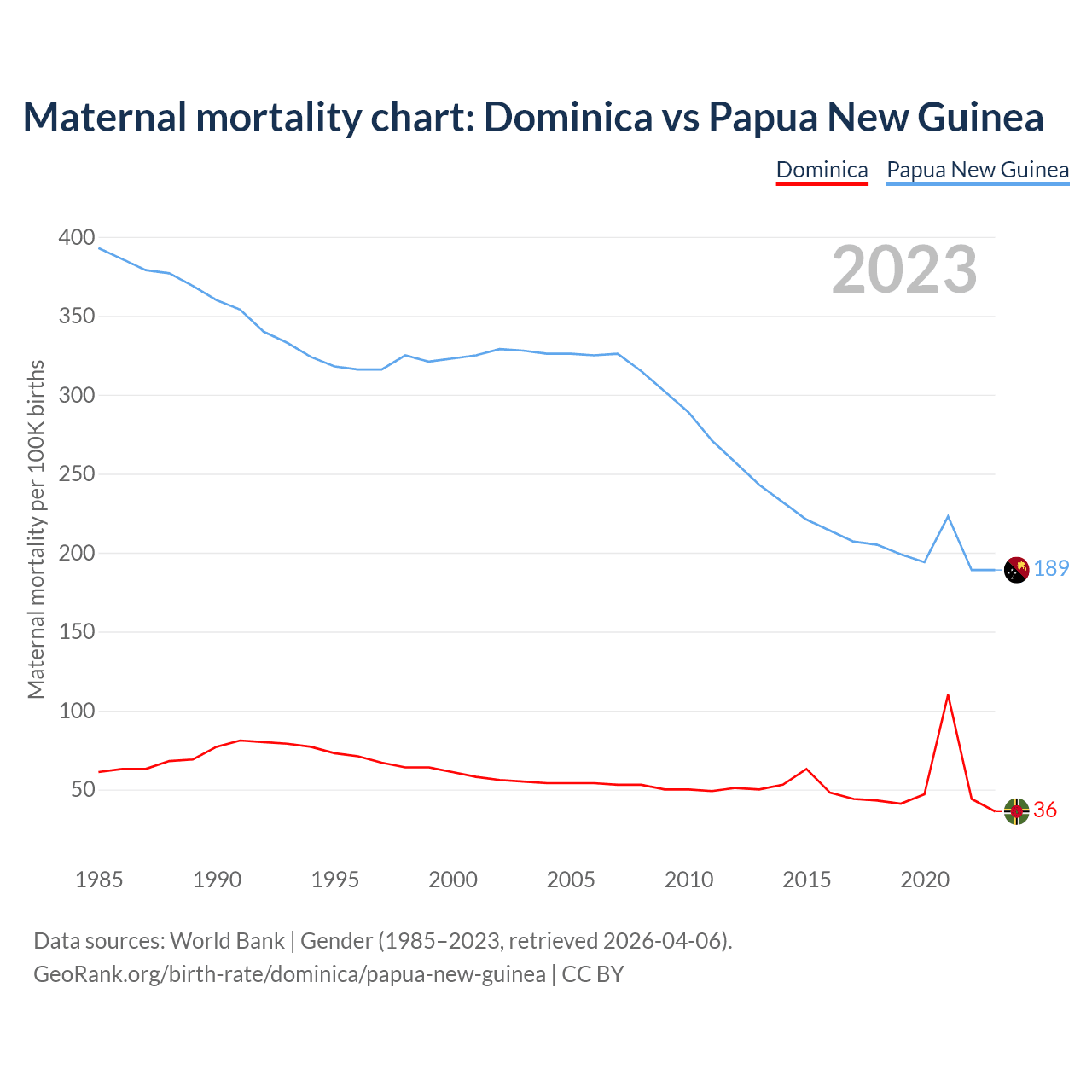The maternal mortality rate, which is the probability of dying during childbirth or within 42 days of pregnancy termination, is 36 deaths per 100,000 live births in Dominica, compared to 189 deaths in Papua New Guinea.