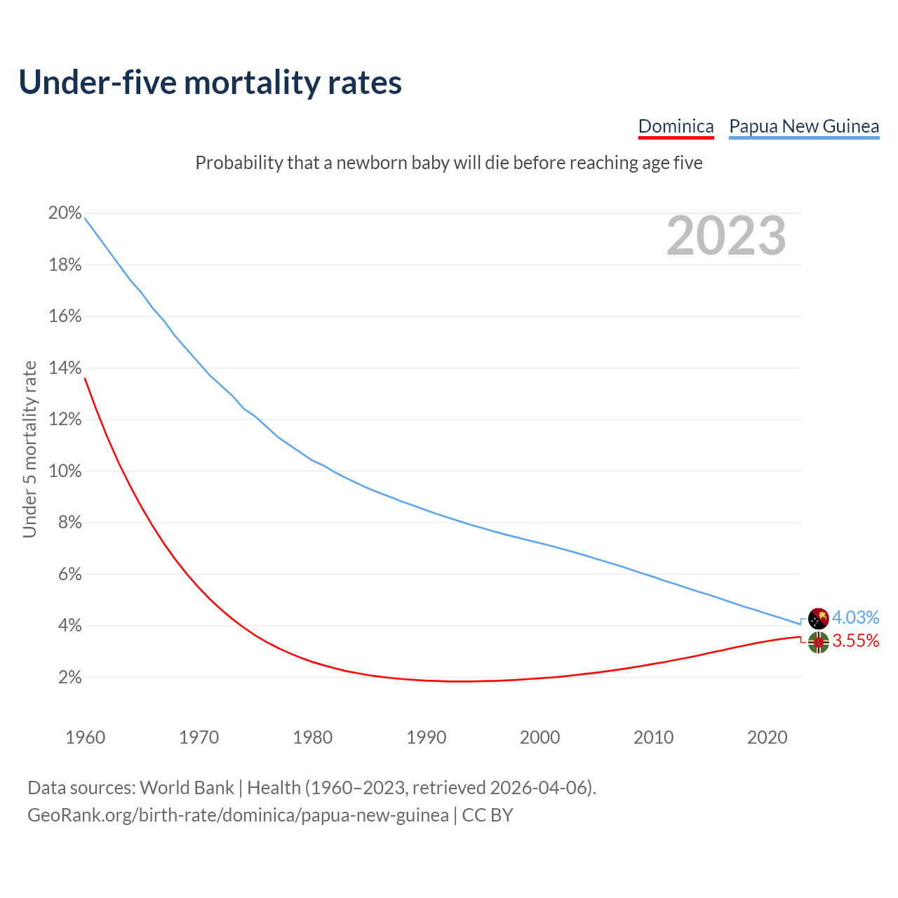 The chance that a newborn baby will die before reaching age five is 3.55% in Dominica and 4.03% in Papua New Guinea. Above is a chart with historical data on under-five mortality rates.