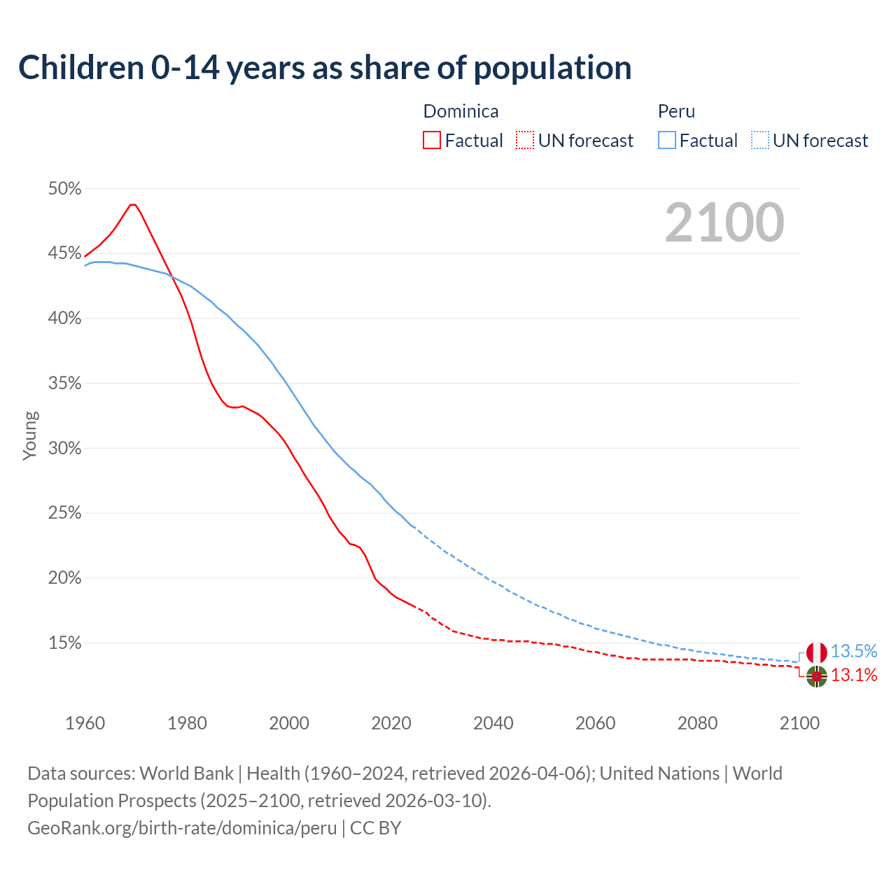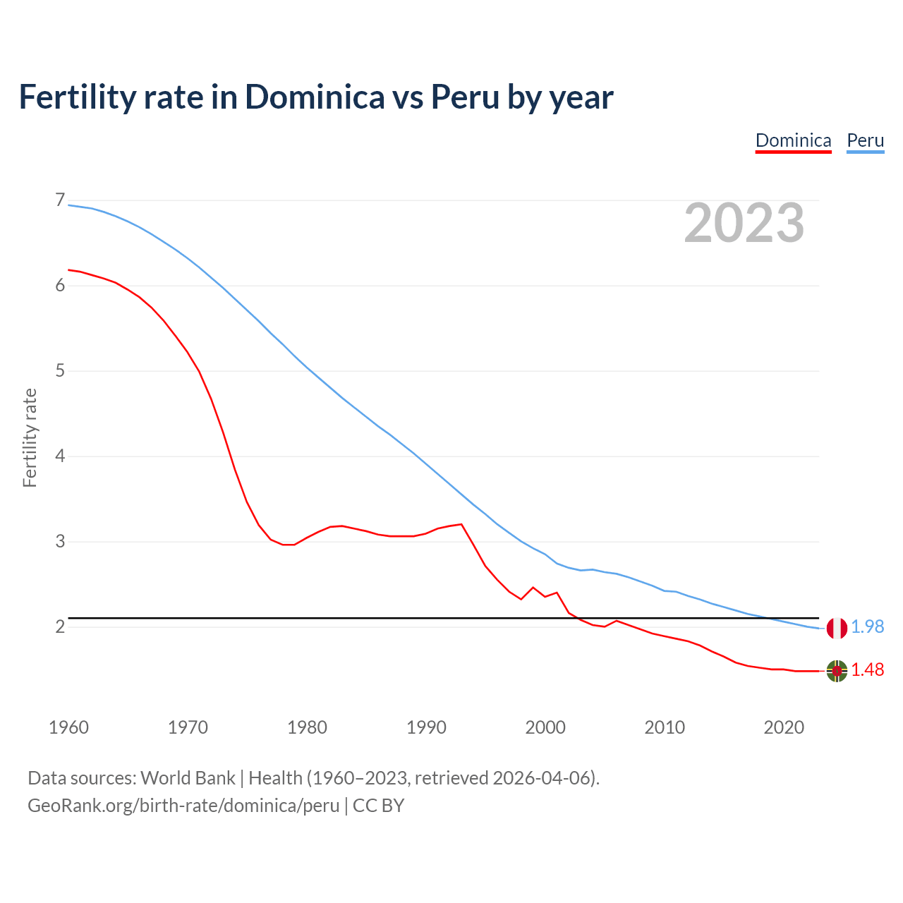 According to the latest available data on birth rates, the fertility rate in Dominica was 1.48 children per woman in 2023, compared to 1.98 in Peru in 2023. The replacement level is considered to be 2.1 children per woman.