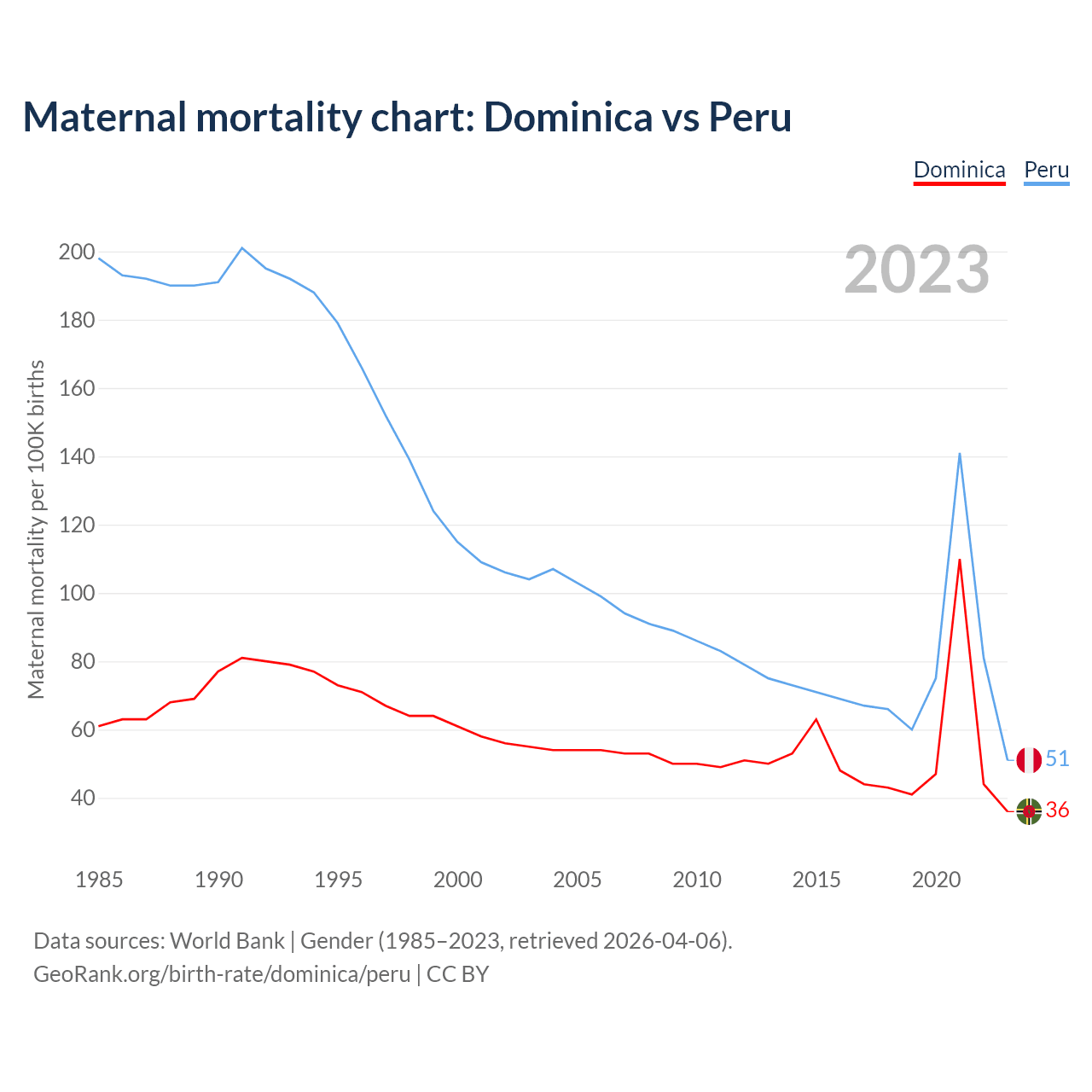 The maternal mortality rate, which is the probability of dying during childbirth or within 42 days of pregnancy termination, is 36 deaths per 100,000 live births in Dominica, compared to 51 deaths in Peru.