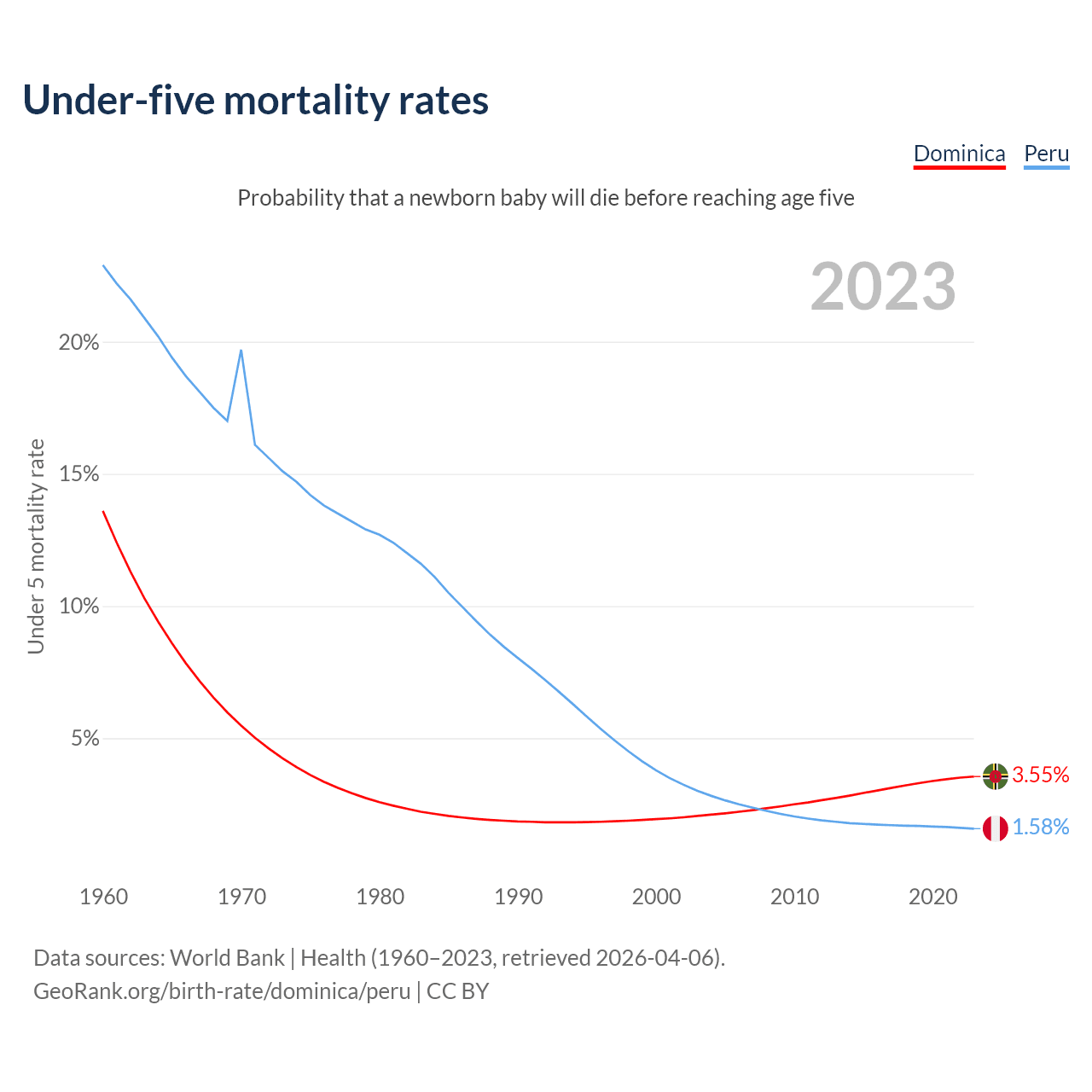 The chance that a newborn baby will die before reaching age five is 3.55% in Dominica and 1.58% in Peru. Above is a chart with historical data on under-five mortality rates.