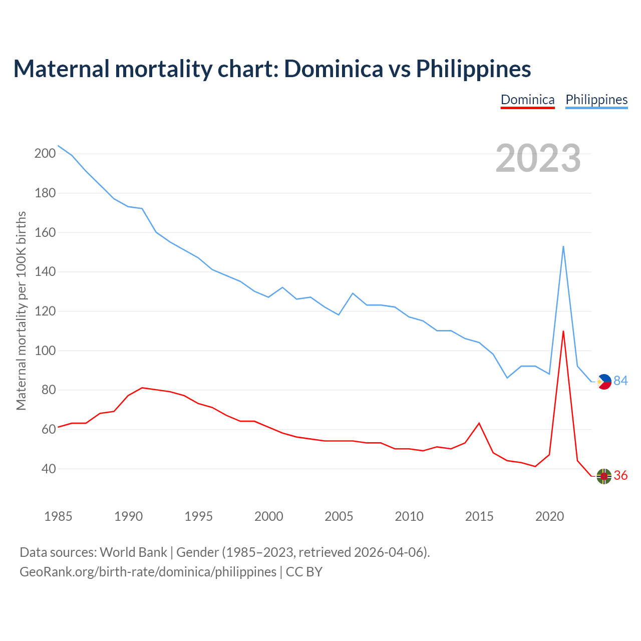 The maternal mortality rate, which is the probability of dying during childbirth or within 42 days of pregnancy termination, is 36 deaths per 100,000 live births in Dominica, compared to 84 deaths in the Philippines.