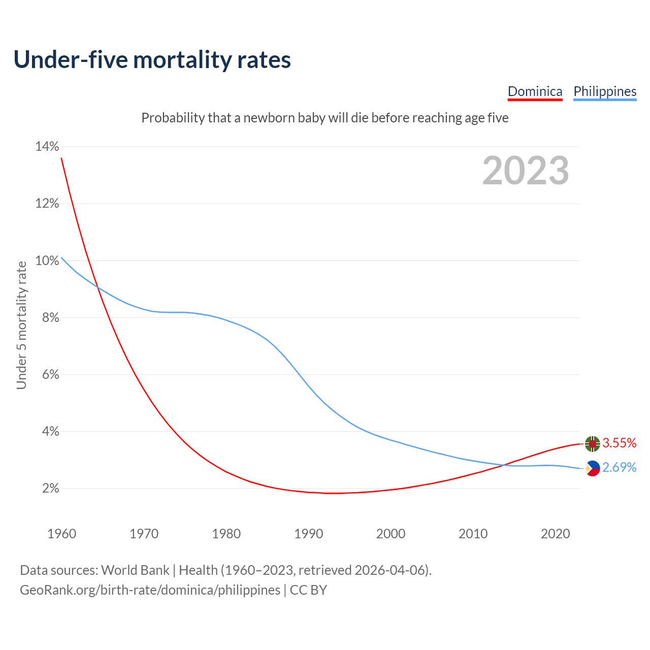 The chance that a newborn baby will die before reaching age five is 3.55% in Dominica and 2.69% in the Philippines. Above is a chart with historical data on under-five mortality rates.