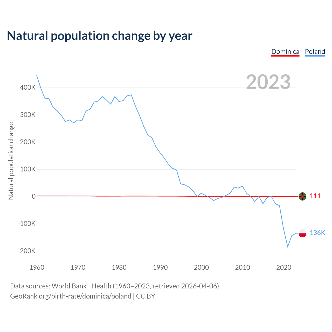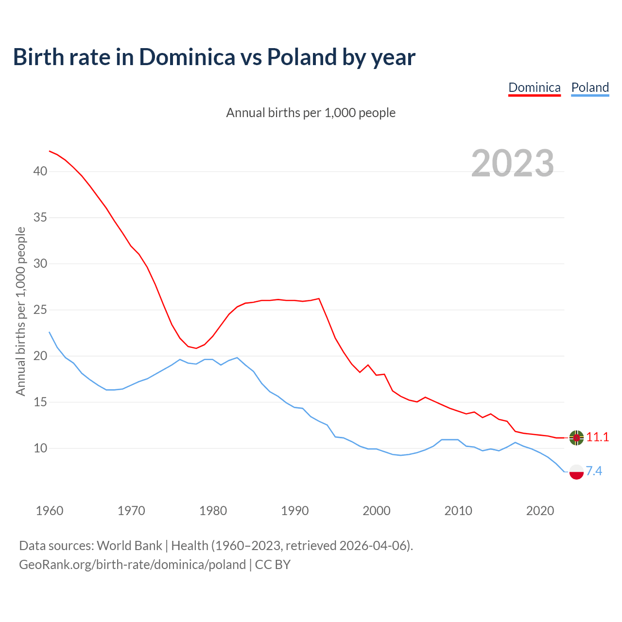 Dominica has an annual birth rate of 11.1 births per 1,000 people, compared to 7.4 for Poland. The average number of children a woman is expected to have during her lifetime — the fertility rate, is 1.48 in Dominica and 1.16 in Poland — 22% difference.