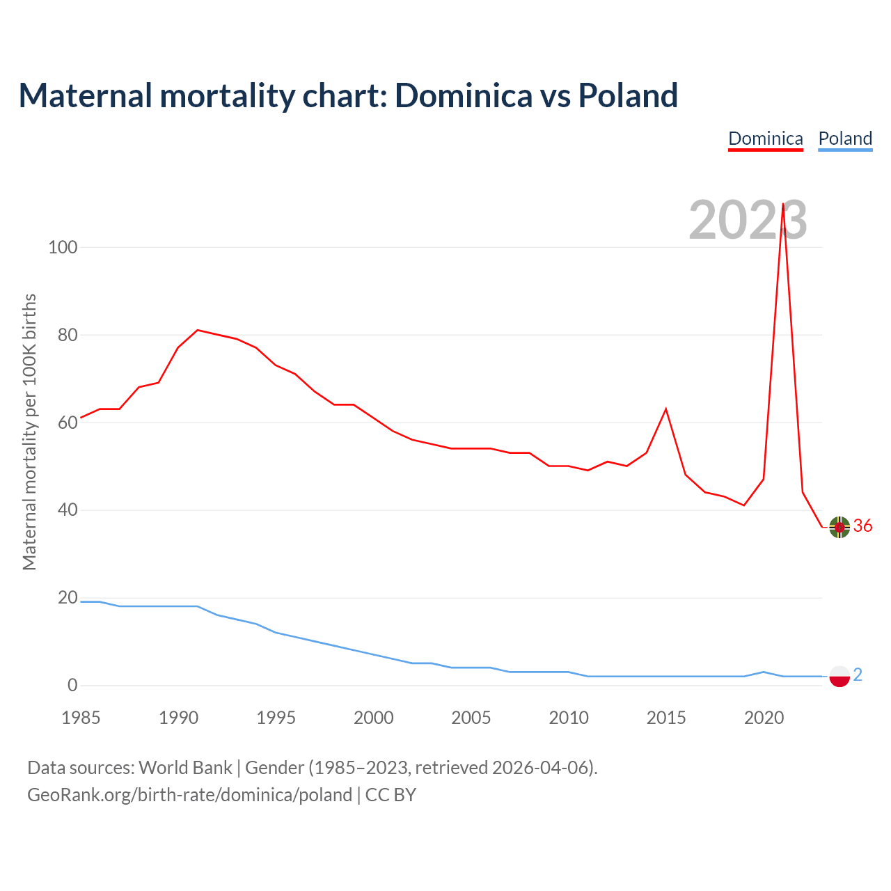 The maternal mortality rate, which is the probability of dying during childbirth or within 42 days of pregnancy termination, is 36 deaths per 100,000 live births in Dominica, compared to 2 deaths in Poland.