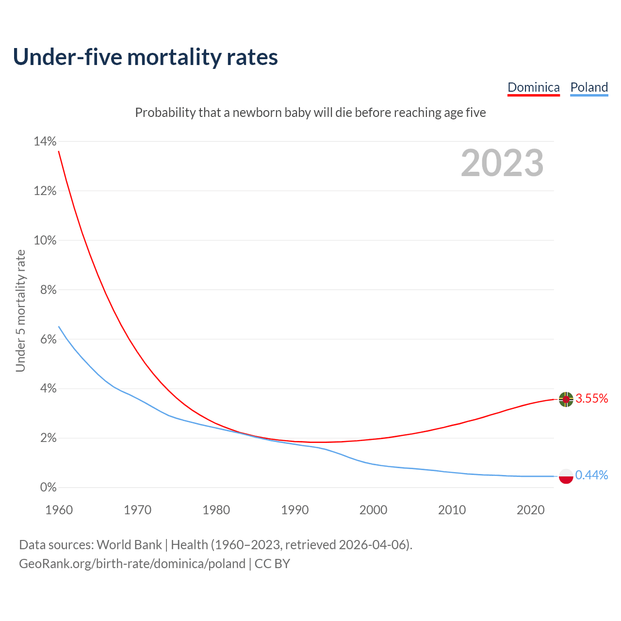 The chance that a newborn baby will die before reaching age five is 3.55% in Dominica and 0.44% in Poland. Above is a chart with historical data on under-five mortality rates.