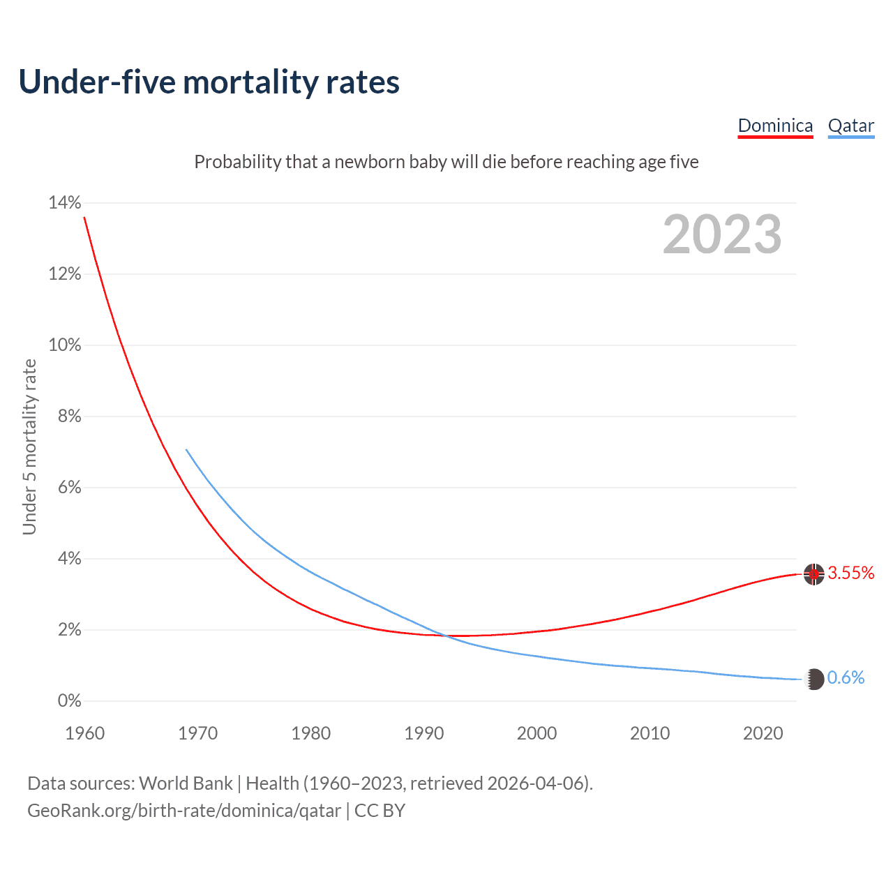 The chance that a newborn baby will die before reaching age five is 3.55% in Dominica and 0.6% in Qatar. Above is a chart with historical data on under-five mortality rates.