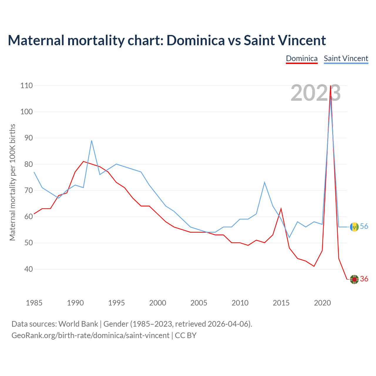 The maternal mortality rate, which is the probability of dying during childbirth or within 42 days of pregnancy termination, is 36 deaths per 100,000 live births in Dominica, compared to 56 deaths in Saint Vincent.