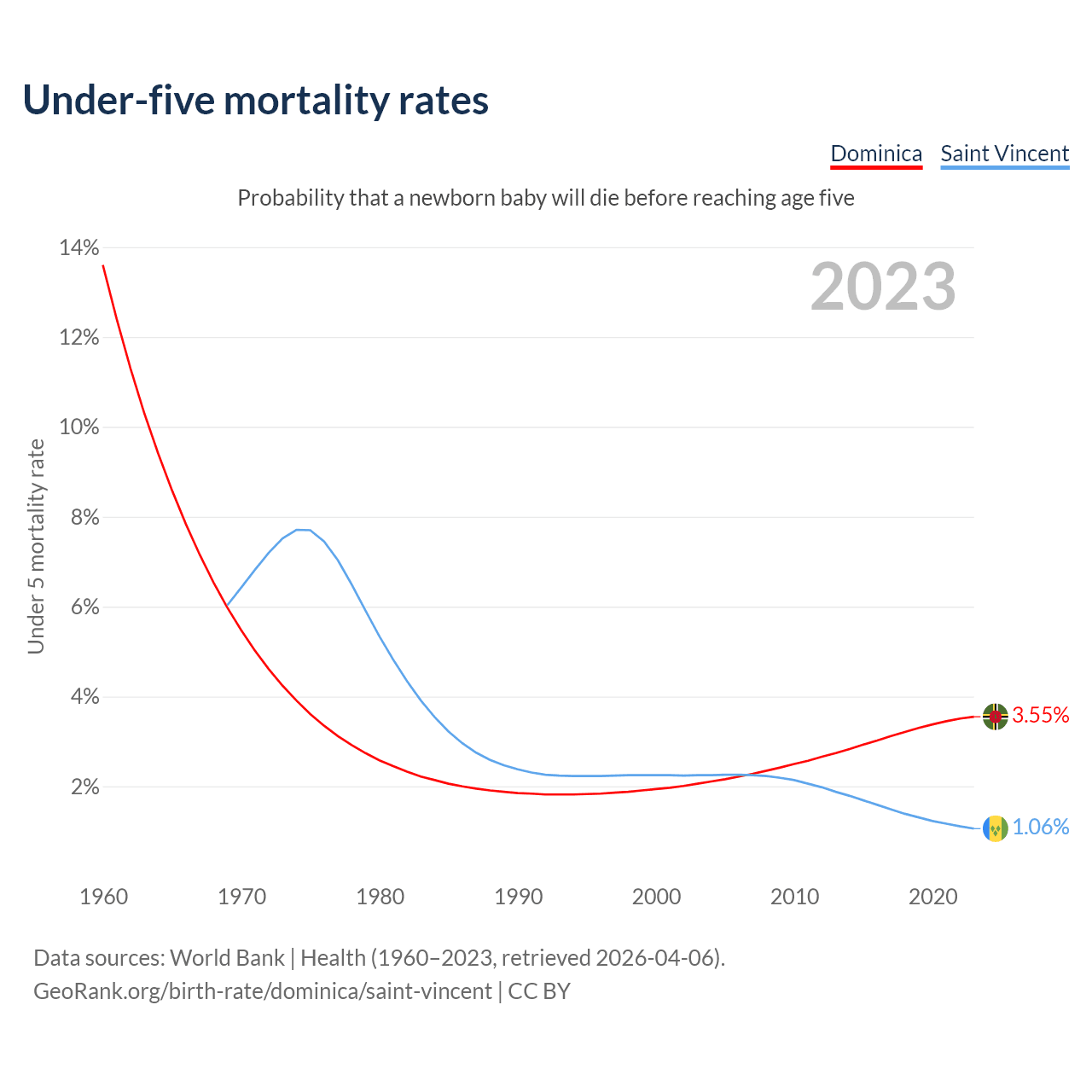 The chance that a newborn baby will die before reaching age five is 3.55% in Dominica and 1.06% in Saint Vincent. Above is a chart with historical data on under-five mortality rates.