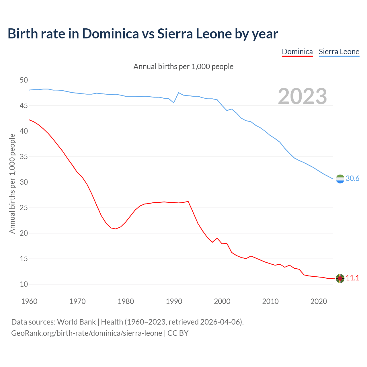 Dominica has an annual birth rate of 11.1 births per 1,000 people, compared to 30.6 for Sierra Leone. The average number of children a woman is expected to have during her lifetime — the fertility rate, is 1.48 in Dominica and 3.79 in Sierra Leone — 155.5% difference.