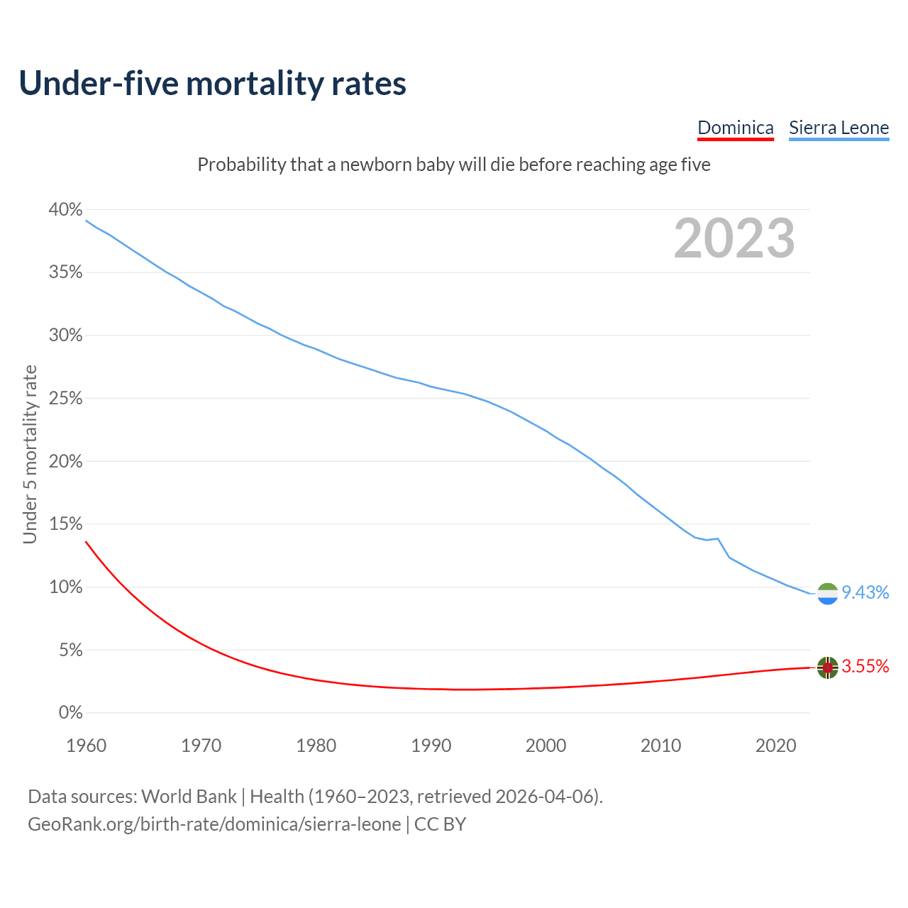 The chance that a newborn baby will die before reaching age five is 3.55% in Dominica and 9.43% in Sierra Leone. Above is a chart with historical data on under-five mortality rates.