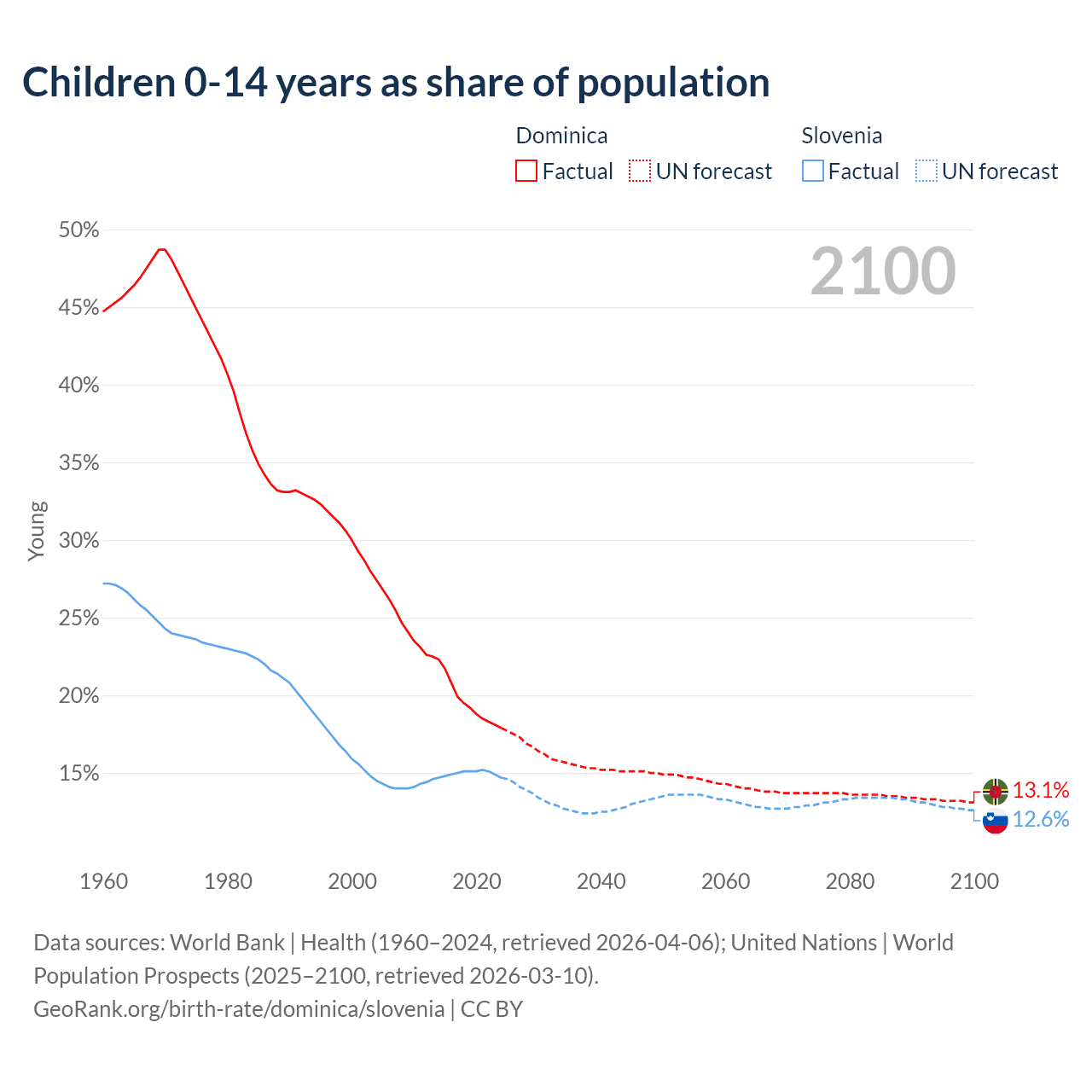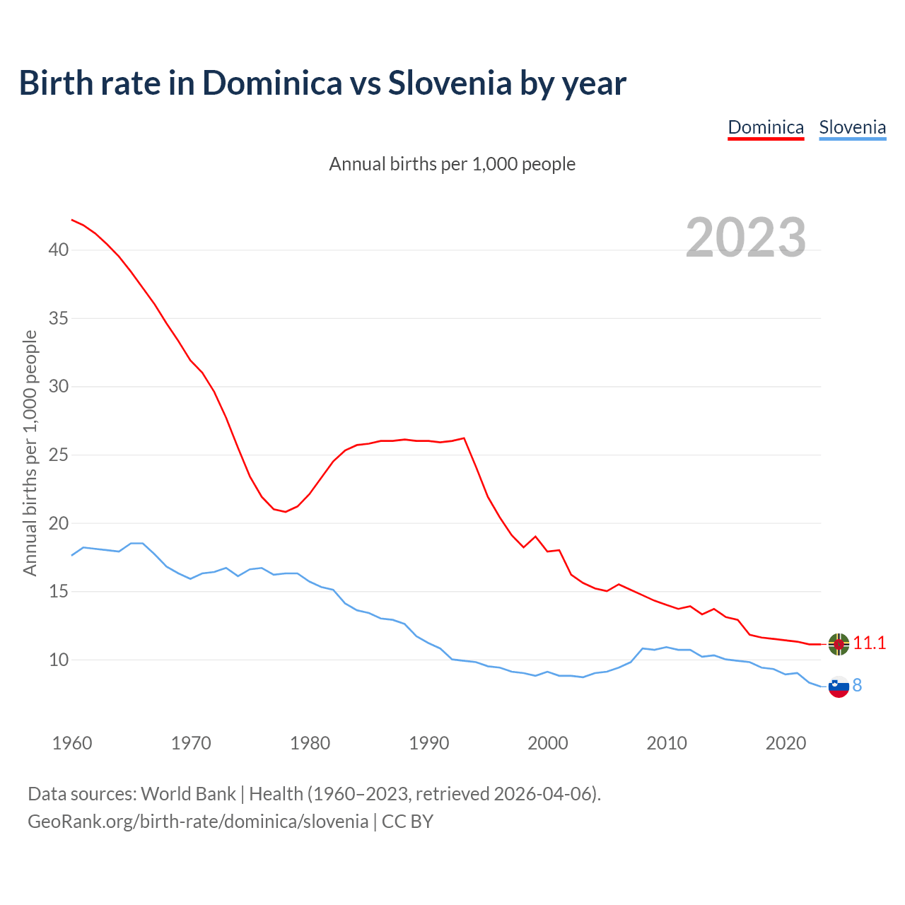 Dominica has an annual birth rate of 11.1 births per 1,000 people, compared to 8 for Slovenia. The average number of children a woman is expected to have during her lifetime — the fertility rate, is 1.48 in Dominica and 1.51 in Slovenia — 1.75% difference.