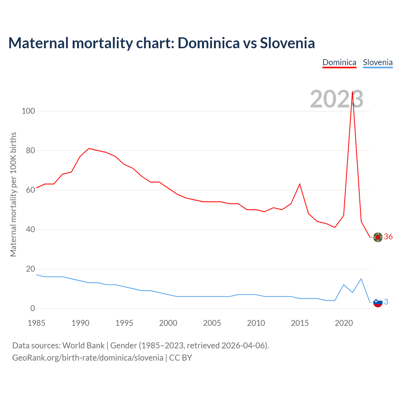The maternal mortality rate, which is the probability of dying during childbirth or within 42 days of pregnancy termination, is 36 deaths per 100,000 live births in Dominica, compared to 3 deaths in Slovenia.