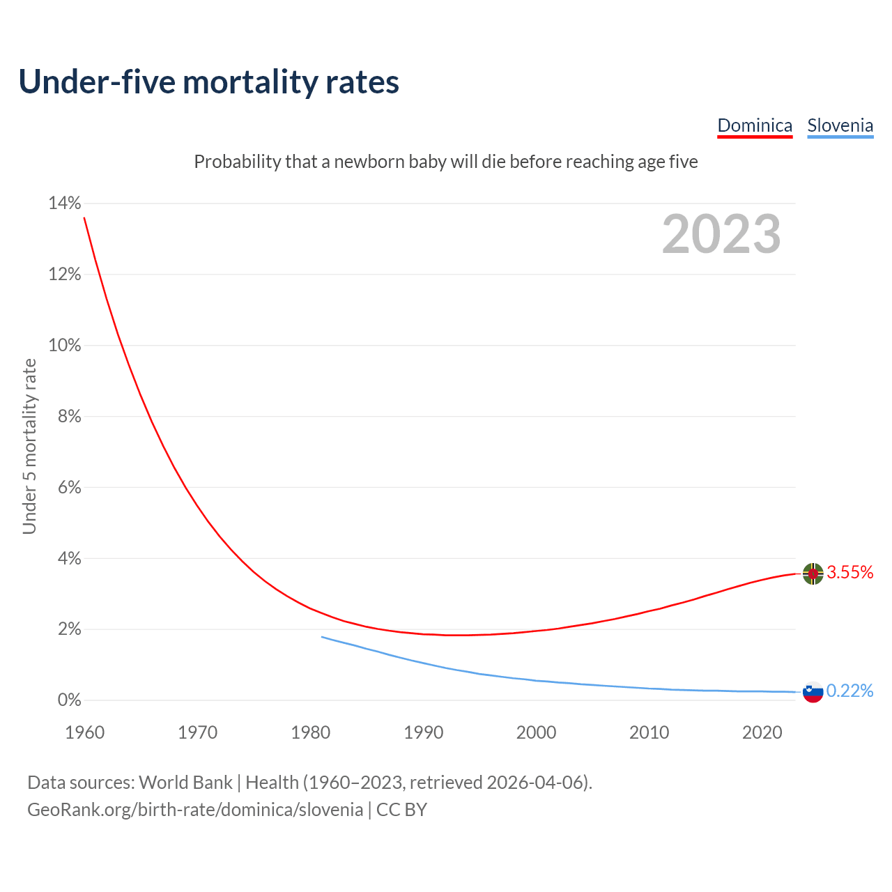 The chance that a newborn baby will die before reaching age five is 3.55% in Dominica and 0.22% in Slovenia. Above is a chart with historical data on under-five mortality rates.