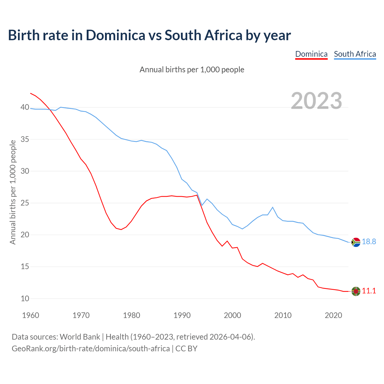 Dominica has an annual birth rate of 11.1 births per 1,000 people, compared to 18.8 for South Africa. The average number of children a woman is expected to have during her lifetime — the fertility rate, is 1.48 in Dominica and 2.22 in South Africa — 49.3% difference.