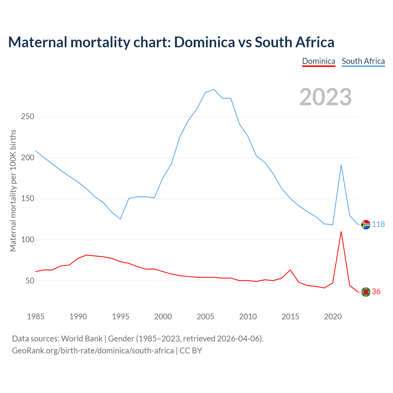 The maternal mortality rate, which is the probability of dying during childbirth or within 42 days of pregnancy termination, is 36 deaths per 100,000 live births in Dominica, compared to 118 deaths in South Africa.