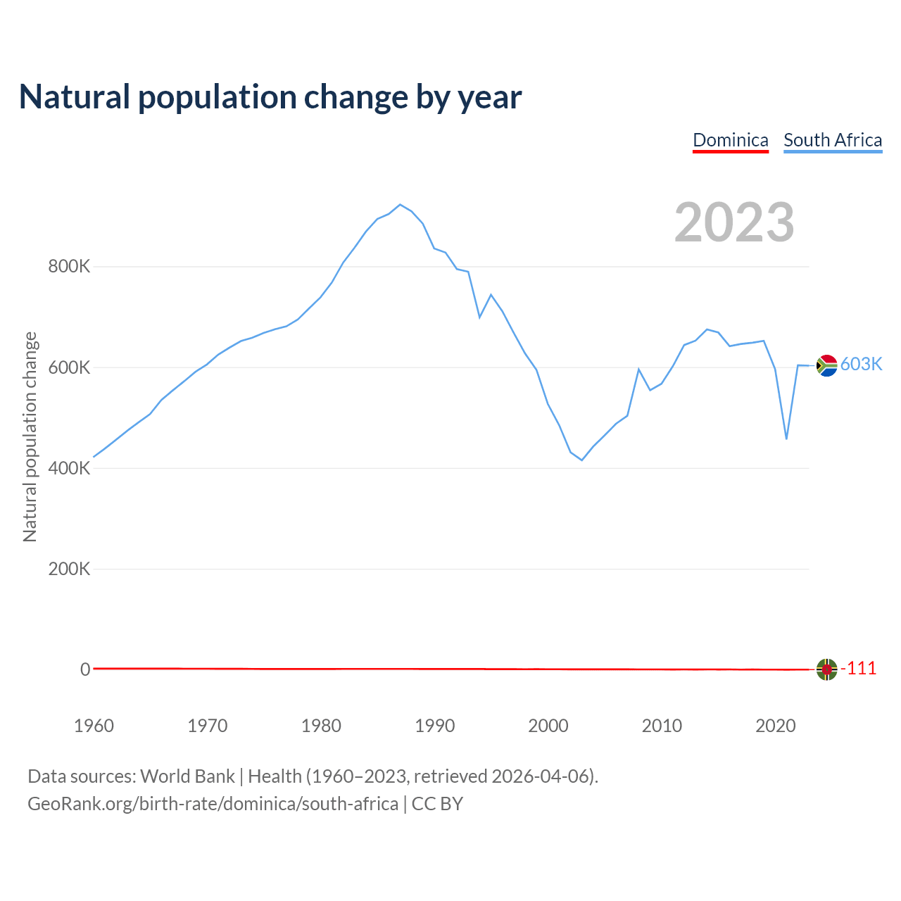 - Dominica is ranked 129/196 by birth rate compared to 82/196 for South Africa.