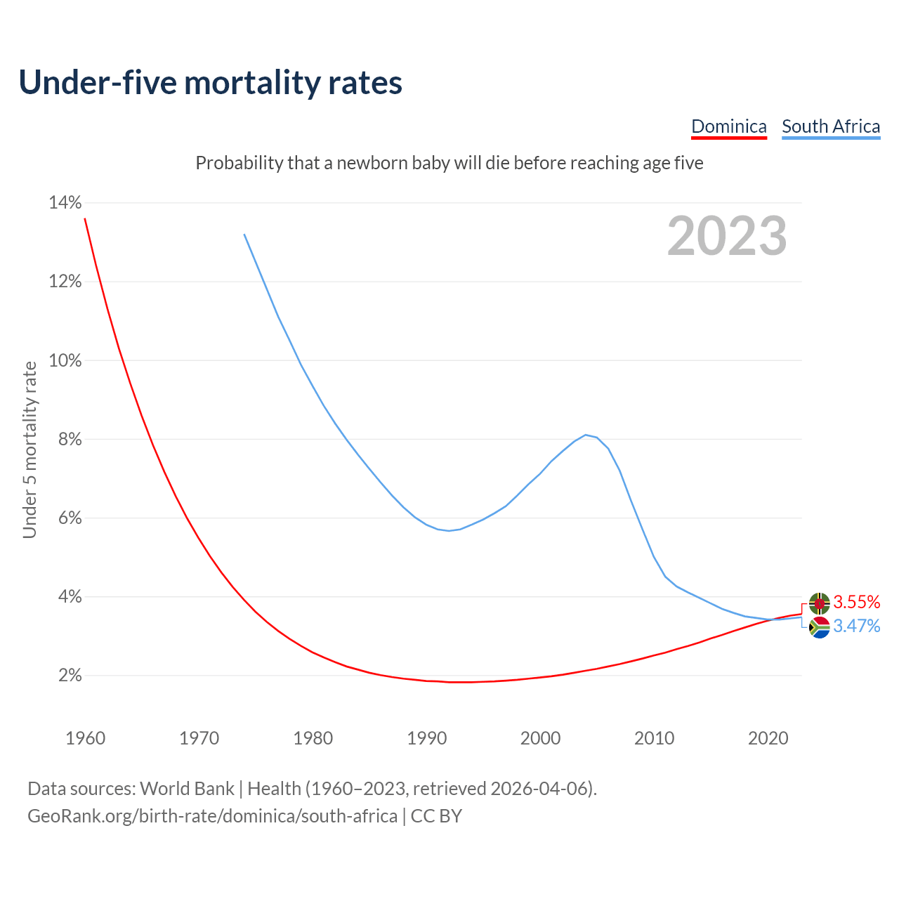 The chance that a newborn baby will die before reaching age five is 3.55% in Dominica and 3.47% in South Africa. Above is a chart with historical data on under-five mortality rates.