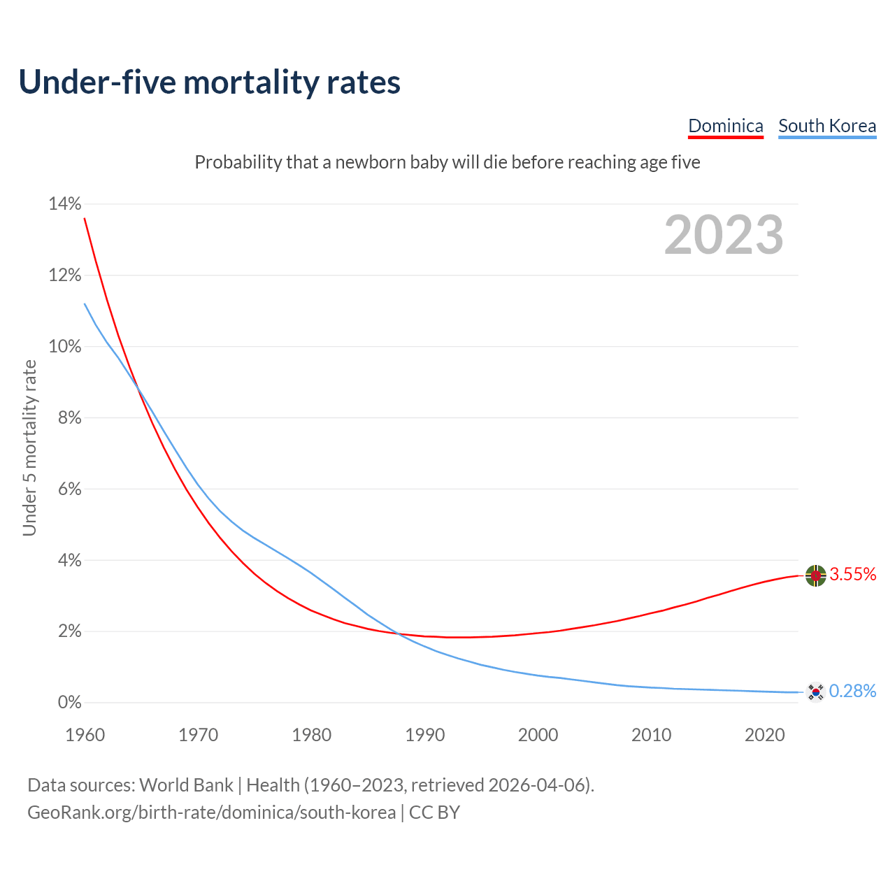 The chance that a newborn baby will die before reaching age five is 3.55% in Dominica and 0.28% in South Korea. Above is a chart with historical data on under-five mortality rates.