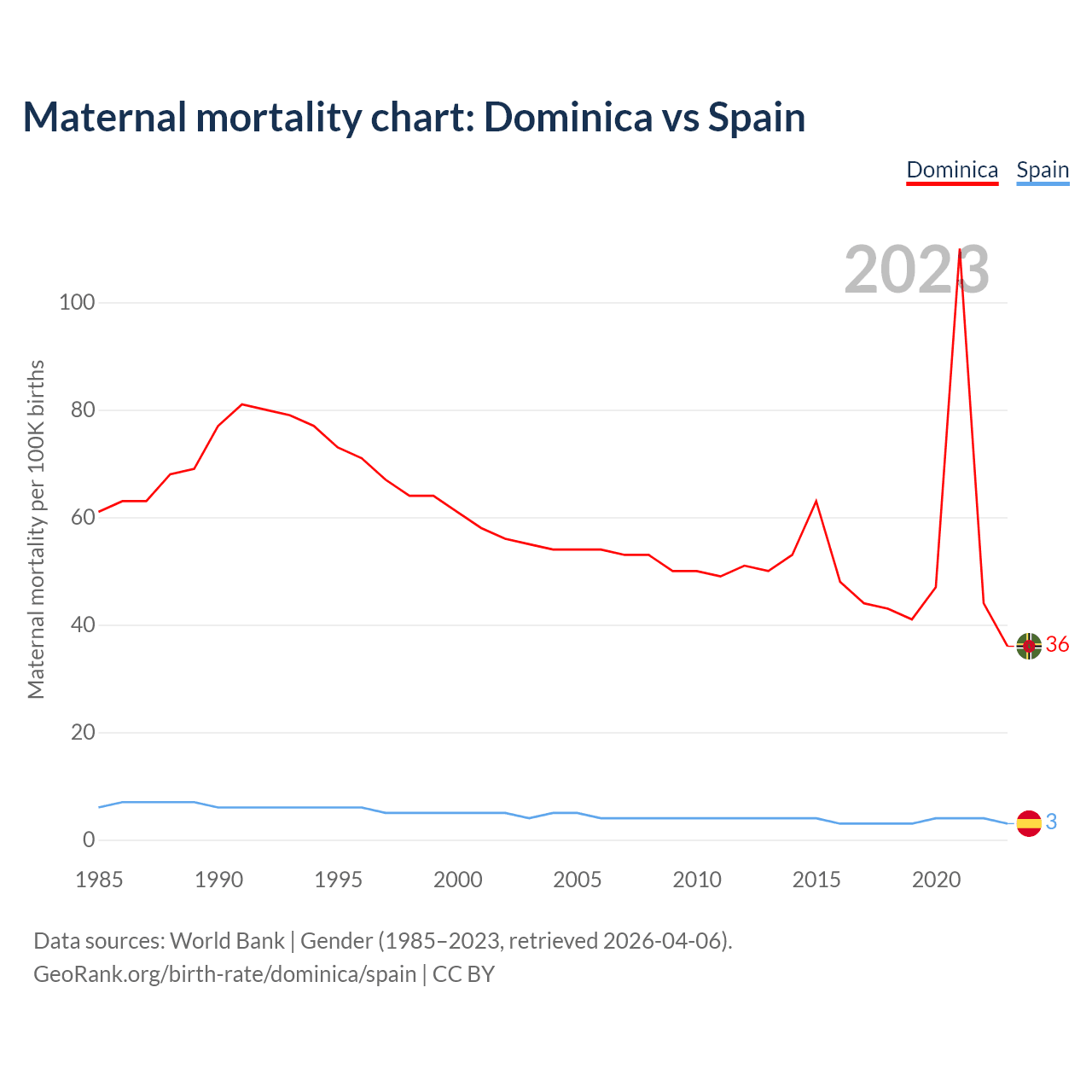 The maternal mortality rate, which is the probability of dying during childbirth or within 42 days of pregnancy termination, is 36 deaths per 100,000 live births in Dominica, compared to 3 deaths in Spain.