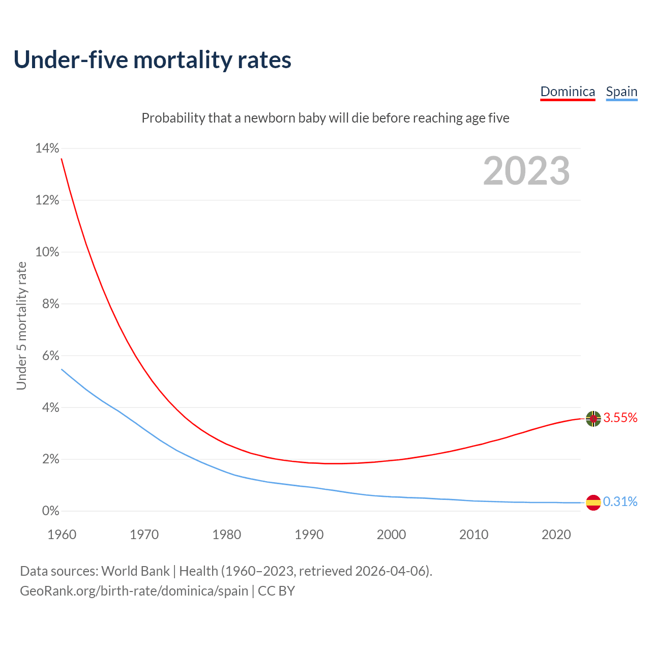 The chance that a newborn baby will die before reaching age five is 3.55% in Dominica and 0.31% in Spain. Above is a chart with historical data on under-five mortality rates.