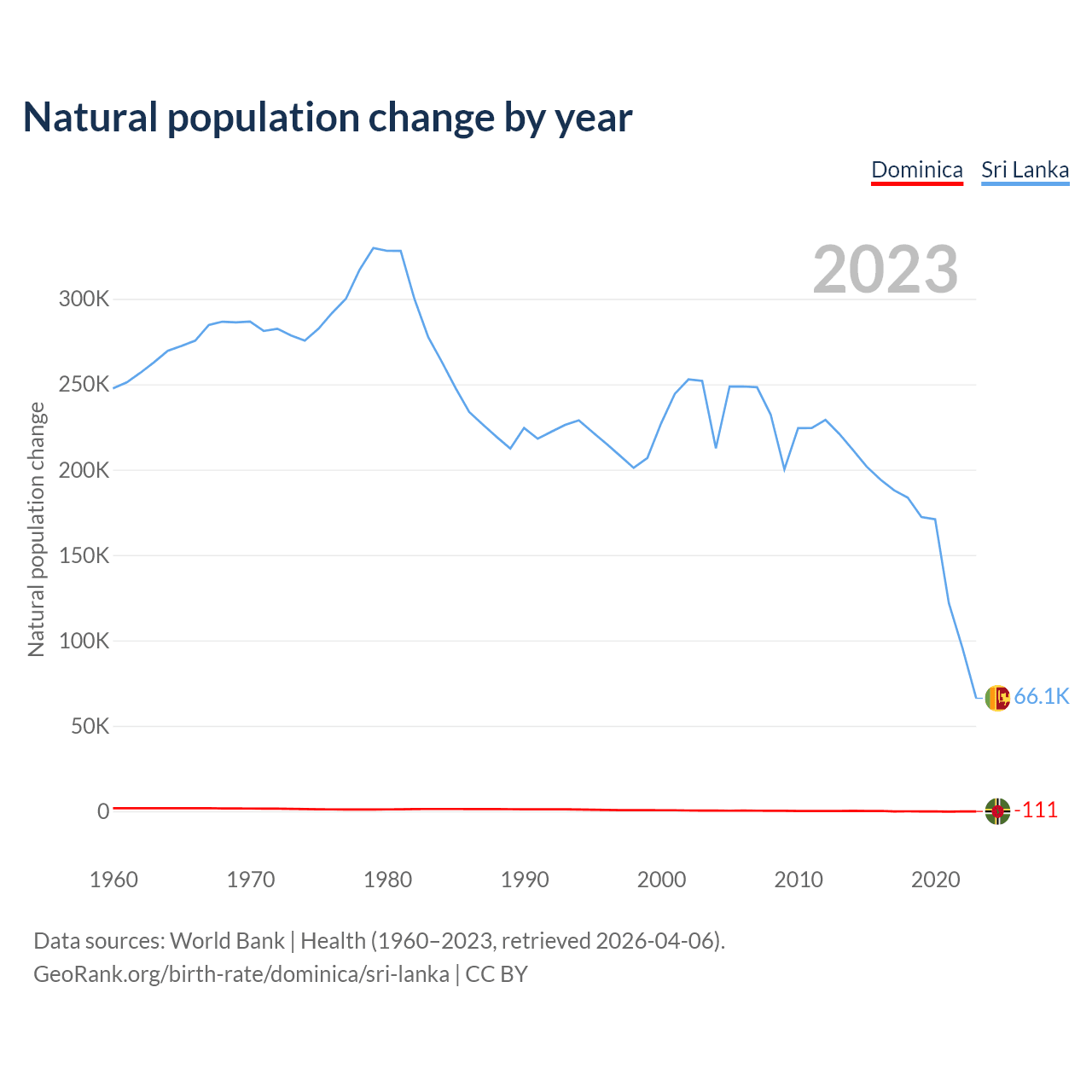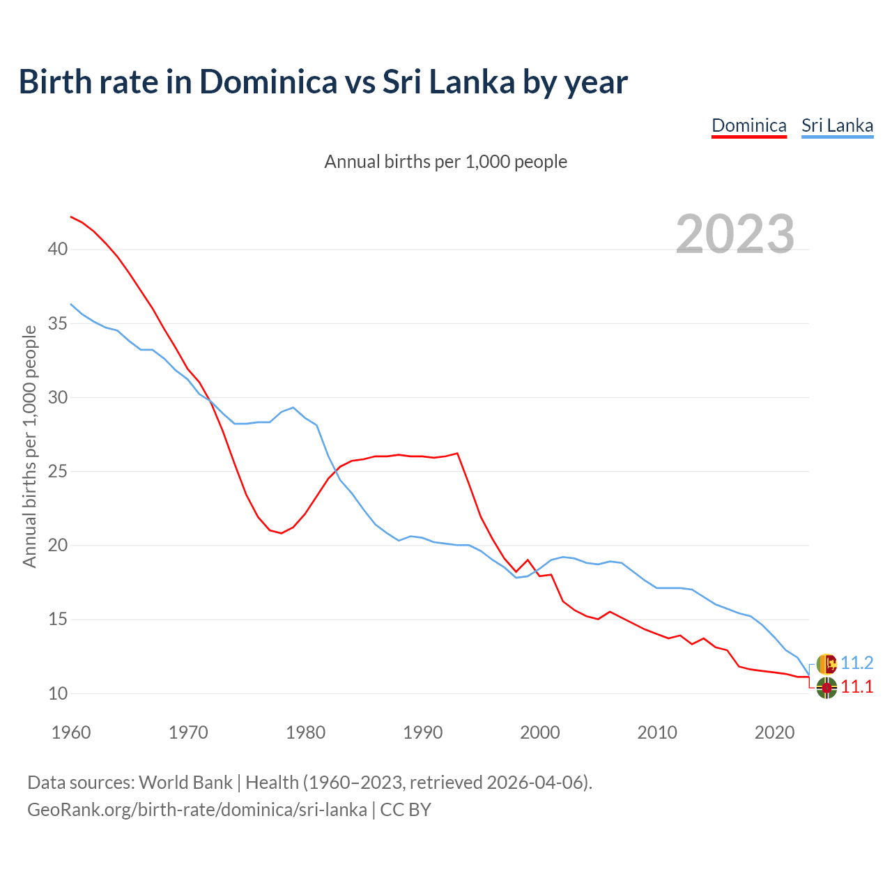 Dominica has an annual birth rate of 11.1 births per 1,000 people, compared to 11.2 for Sri Lanka. The average number of children a woman is expected to have during her lifetime — the fertility rate, is 1.48 in Dominica and 1.97 in Sri Lanka — 33% difference.