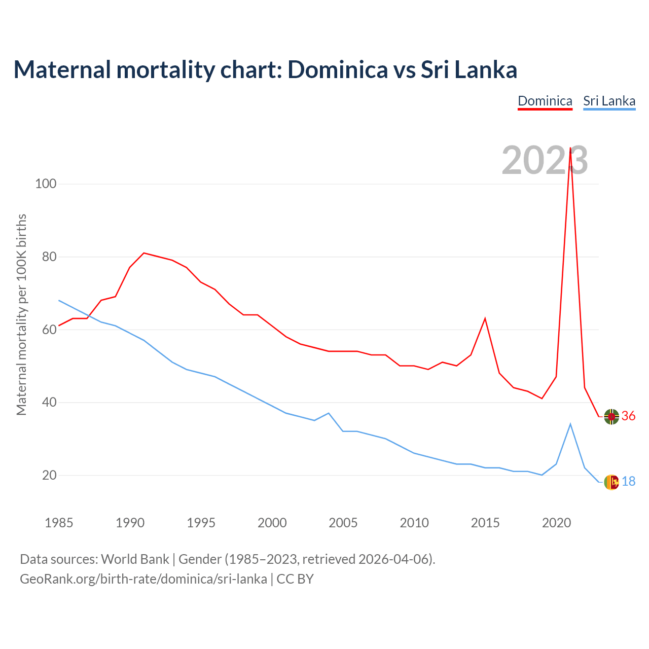 The maternal mortality rate, which is the probability of dying during childbirth or within 42 days of pregnancy termination, is 36 deaths per 100,000 live births in Dominica, compared to 18 deaths in Sri Lanka.