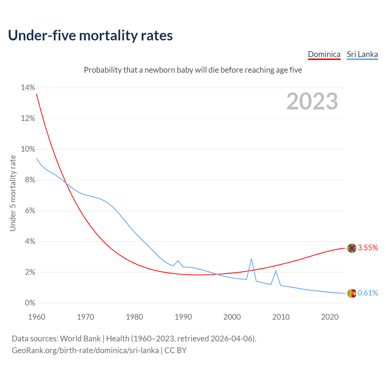 The chance that a newborn baby will die before reaching age five is 3.55% in Dominica and 0.61% in Sri Lanka. Above is a chart with historical data on under-five mortality rates.