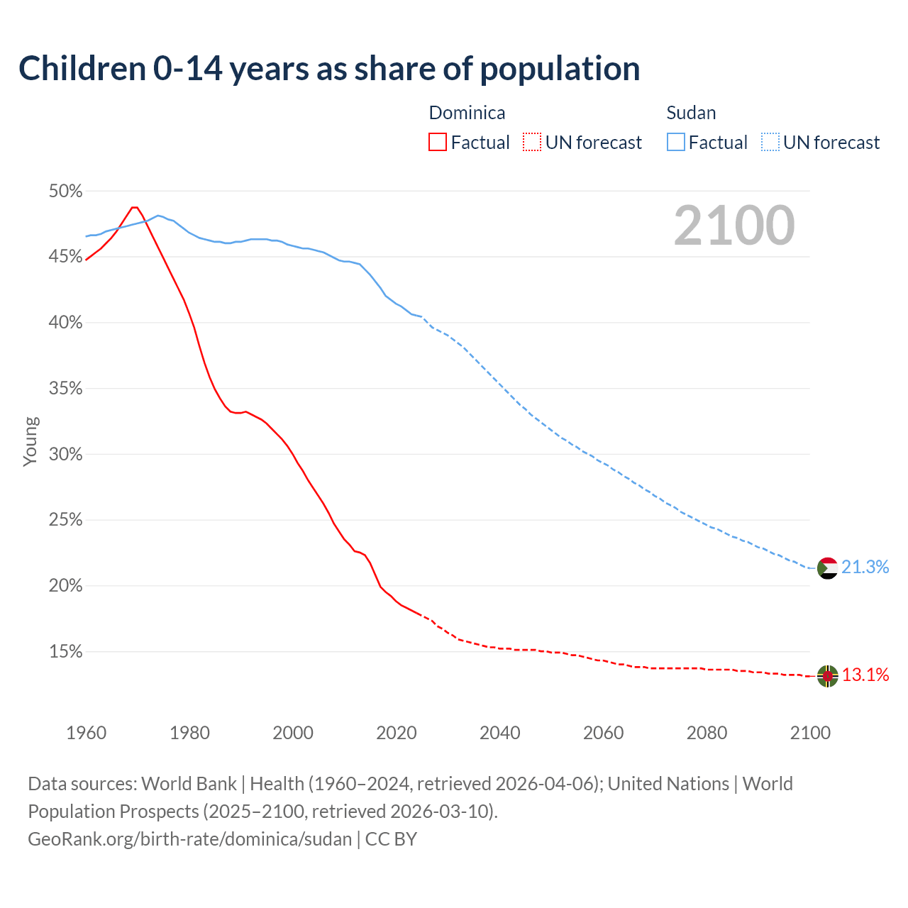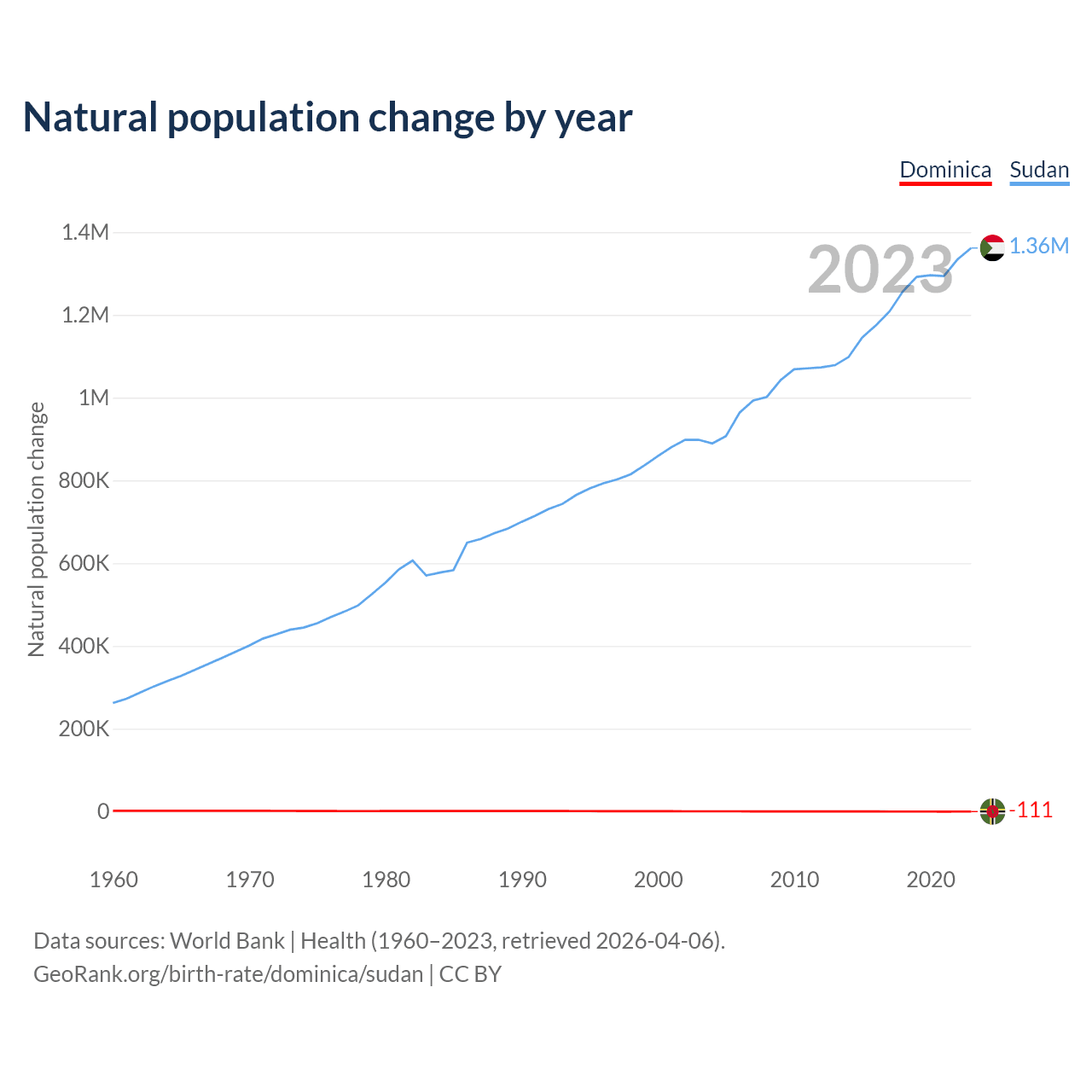 Dominica has an annual birth rate of 11.1 births per 1,000 people, compared to 33.6 for Sudan. The average number of children a woman is expected to have during her lifetime — the fertility rate, is 1.48 in Dominica and 4.32 in Sudan — 191.3% difference.