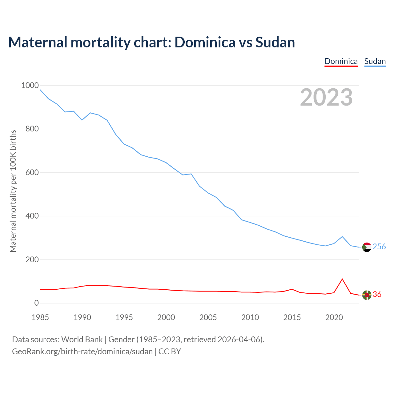 The maternal mortality rate, which is the probability of dying during childbirth or within 42 days of pregnancy termination, is 36 deaths per 100,000 live births in Dominica, compared to 256 deaths in Sudan.