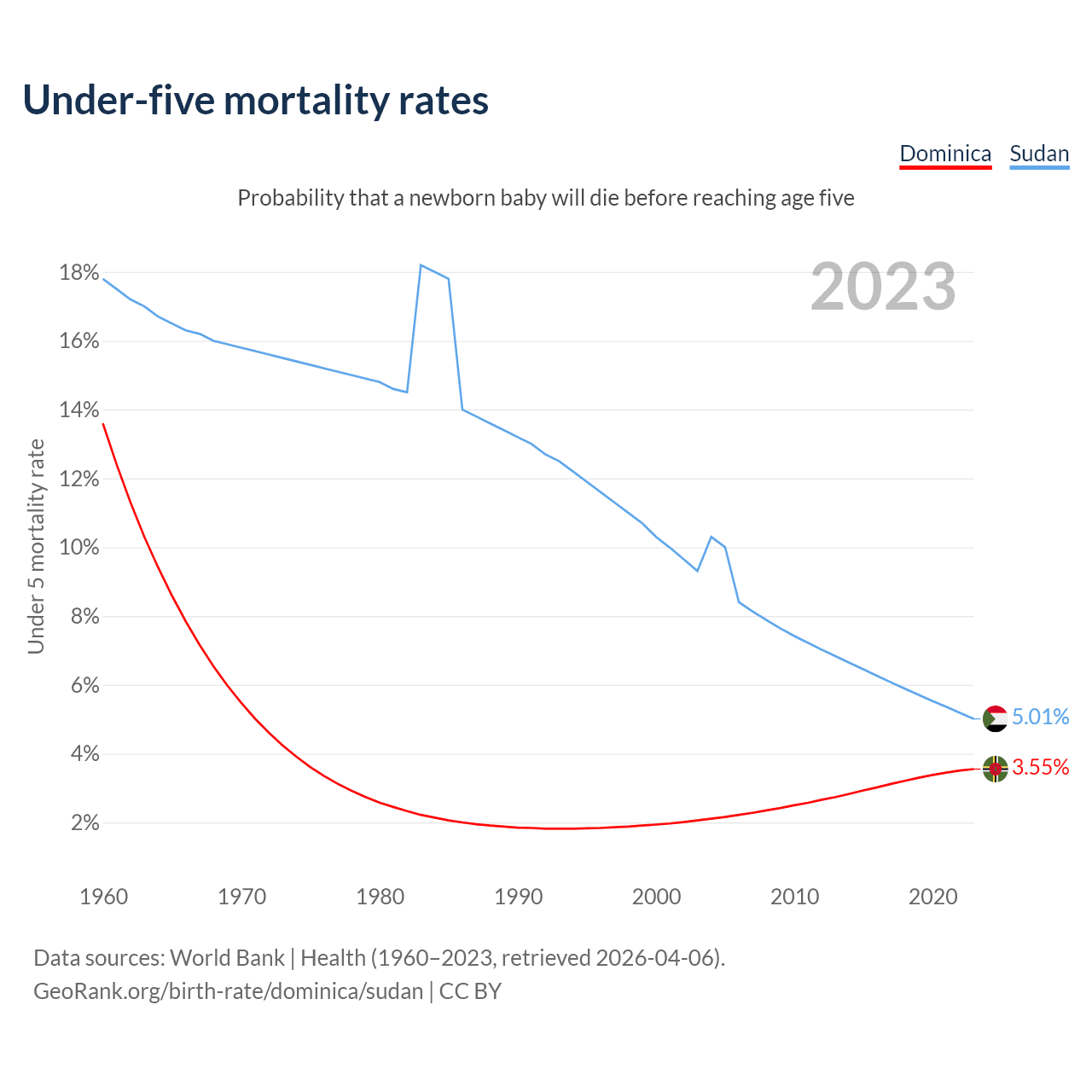 The chance that a newborn baby will die before reaching age five is 3.55% in Dominica and 5.01% in Sudan. Above is a chart with historical data on under-five mortality rates.