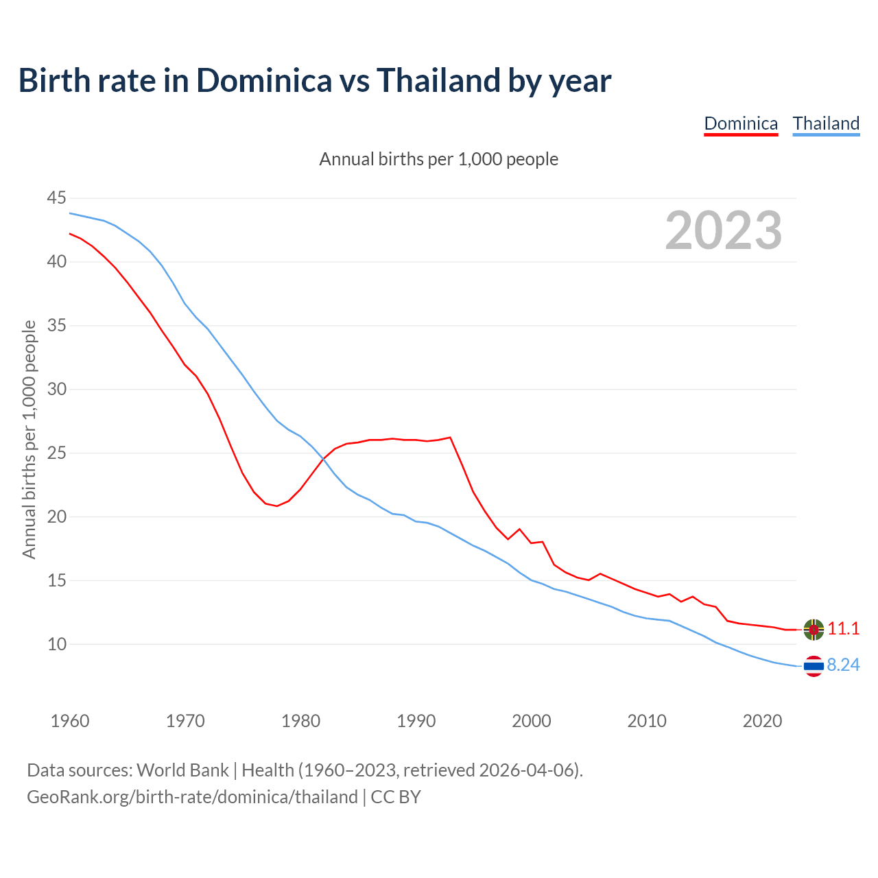 Dominica has an annual birth rate of 11.1 births per 1,000 people, compared to 8.24 for Thailand. The average number of children a woman is expected to have during her lifetime — the fertility rate, is 1.48 in Dominica and 1.21 in Thailand — 18.3% difference.