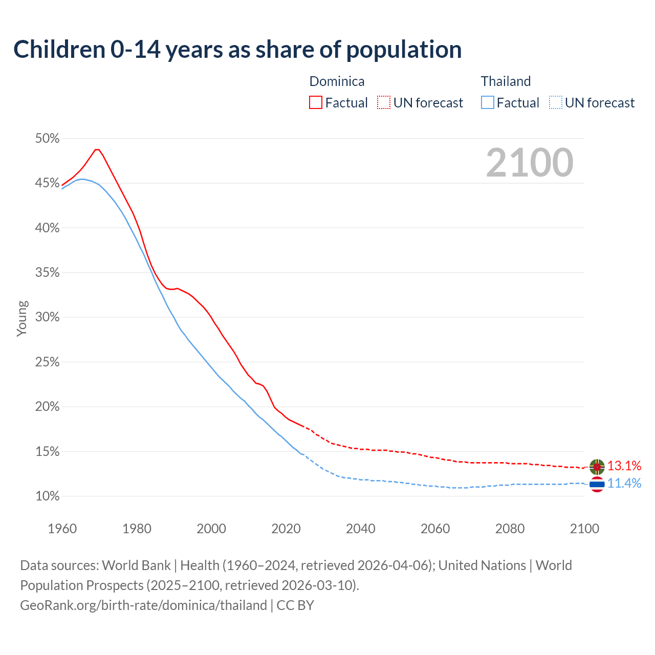 According to the latest available data on birth rates, the fertility rate in Dominica was 1.48 children per woman in 2023, compared to 1.21 in Thailand in 2023. The replacement level is considered to be 2.1 children per woman.
