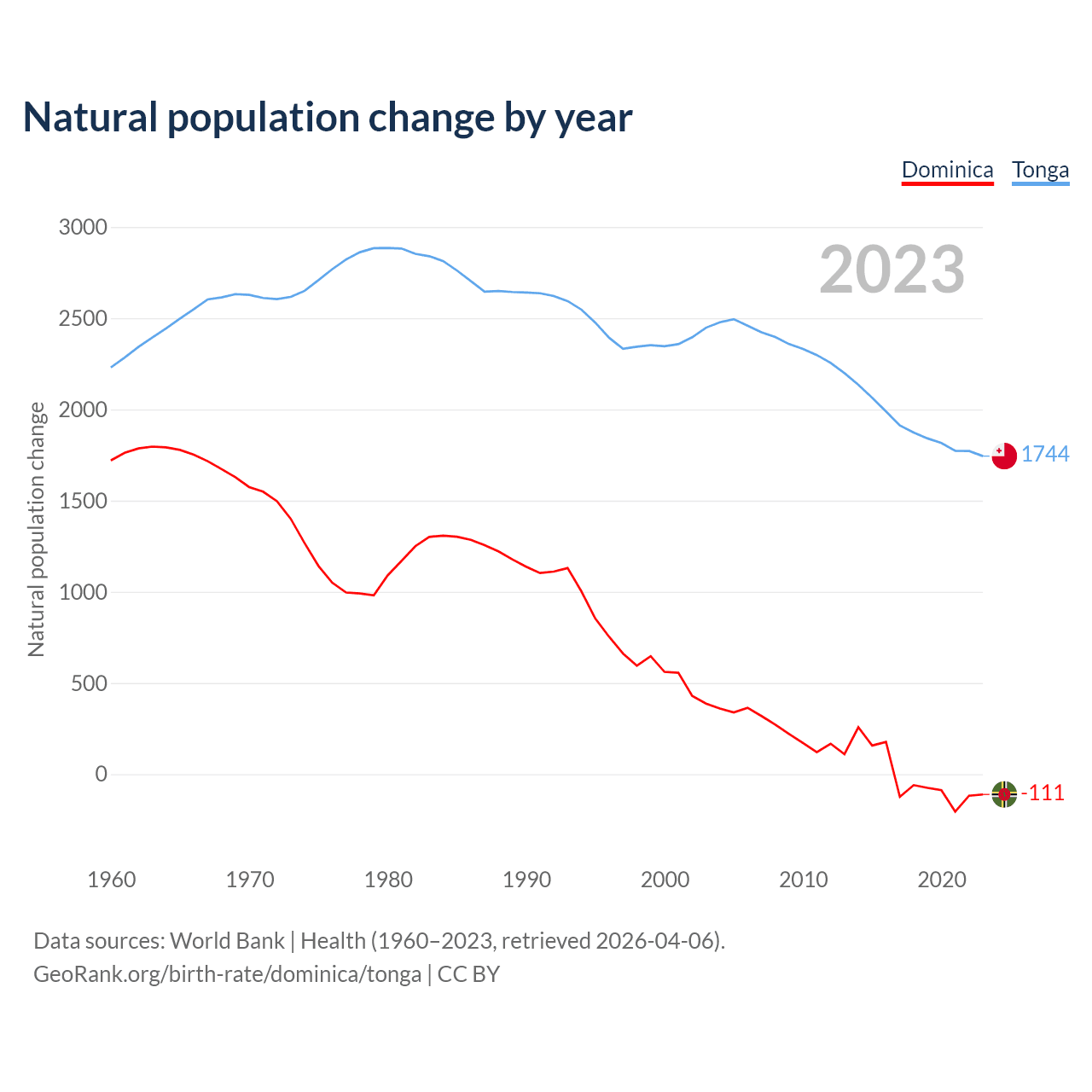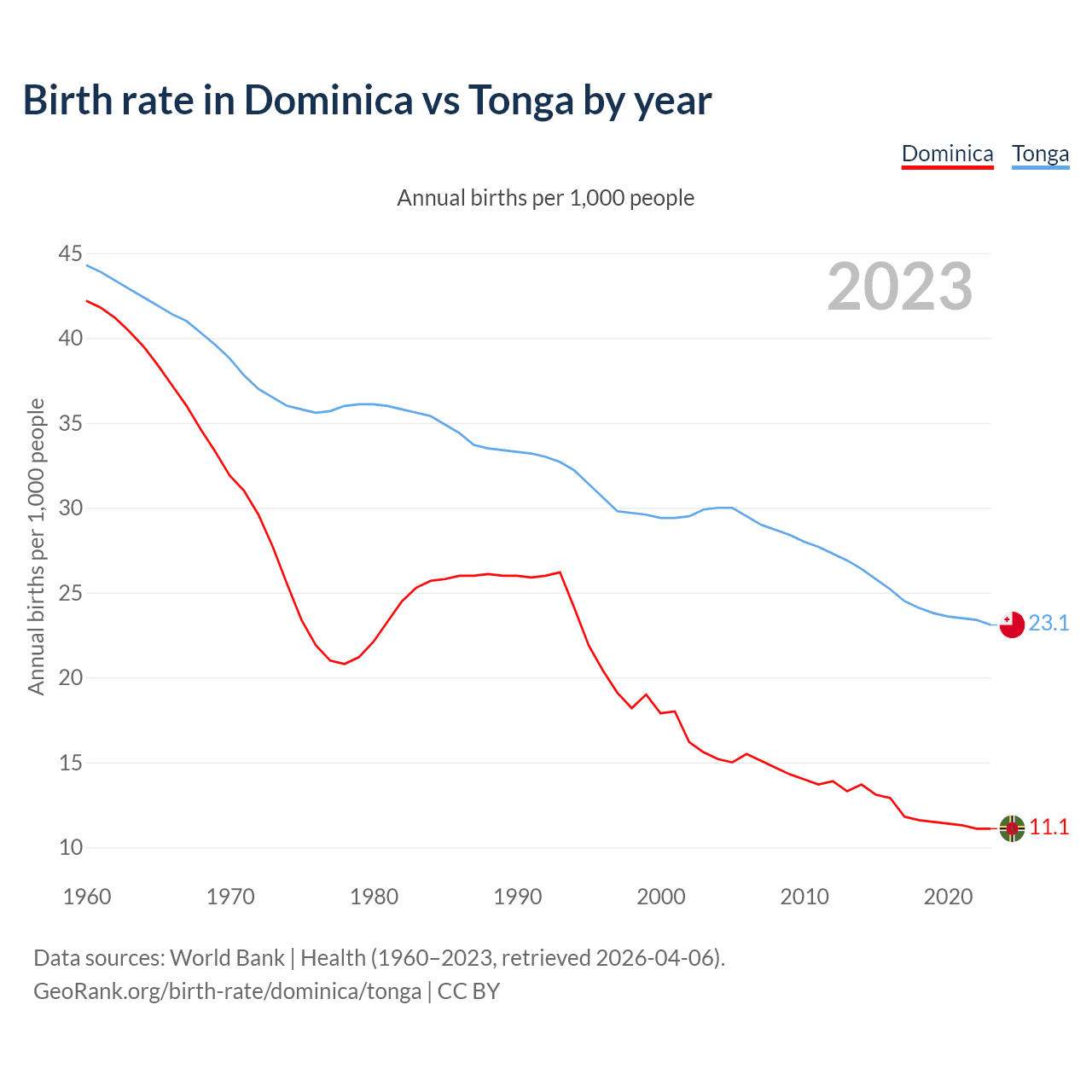 Dominica has an annual birth rate of 11.1 births per 1,000 people, compared to 23.1 for Tonga. The average number of children a woman is expected to have during her lifetime — the fertility rate, is 1.48 in Dominica and 3.13 in Tonga — 110.8% difference.