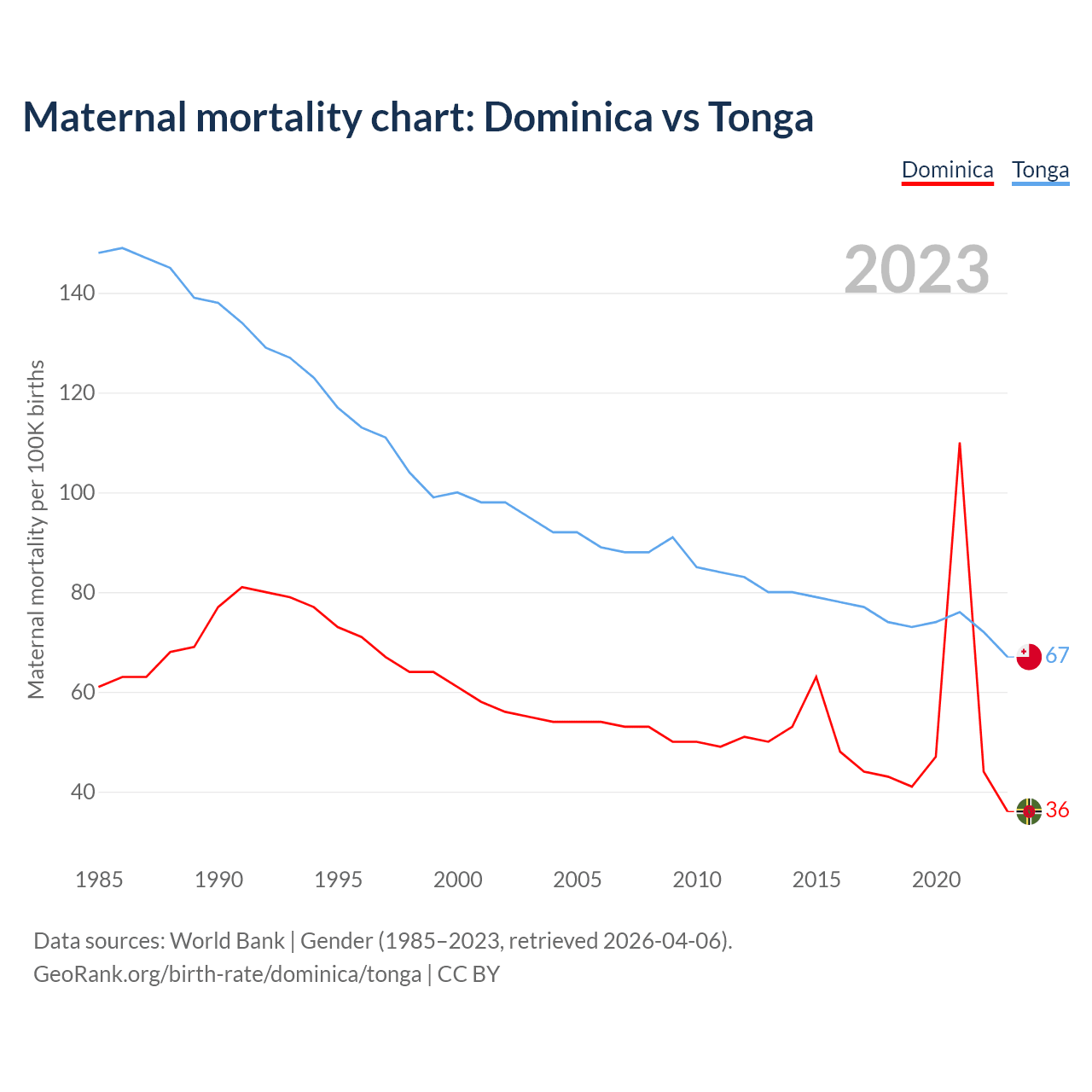 The maternal mortality rate, which is the probability of dying during childbirth or within 42 days of pregnancy termination, is 36 deaths per 100,000 live births in Dominica, compared to 67 deaths in Tonga.