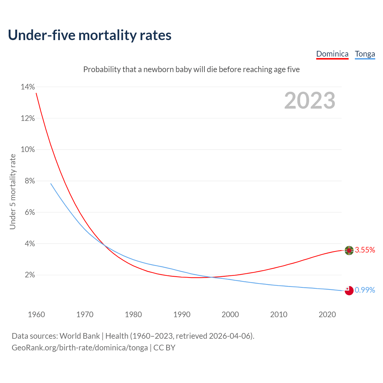 The chance that a newborn baby will die before reaching age five is 3.55% in Dominica and 0.99% in Tonga. Above is a chart with historical data on under-five mortality rates.