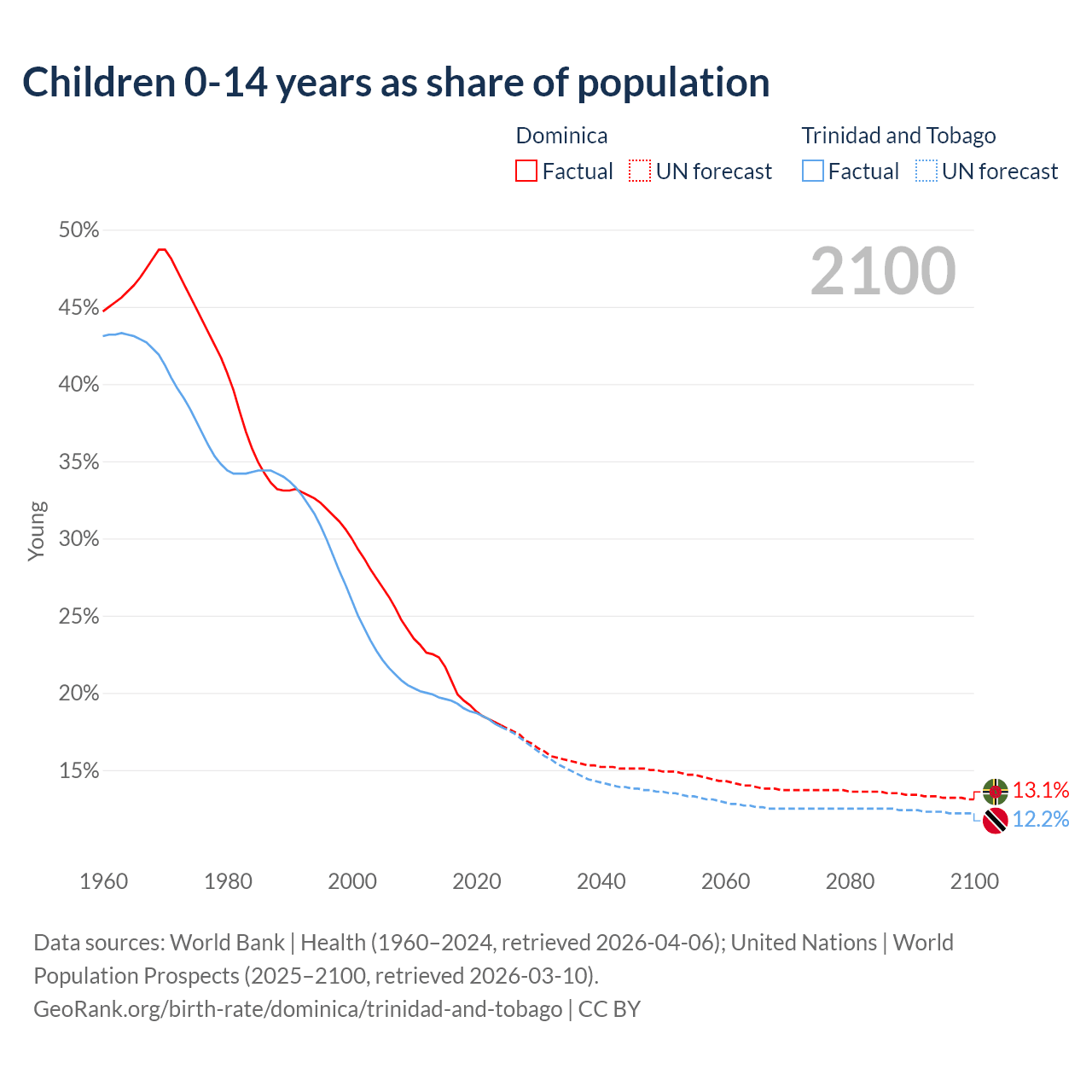 According to the latest available data on birth rates, the fertility rate in Dominica was 1.48 children per woman in 2023, compared to 1.53 in Trinidad and Tobago in 2023. The replacement level is considered to be 2.1 children per woman.