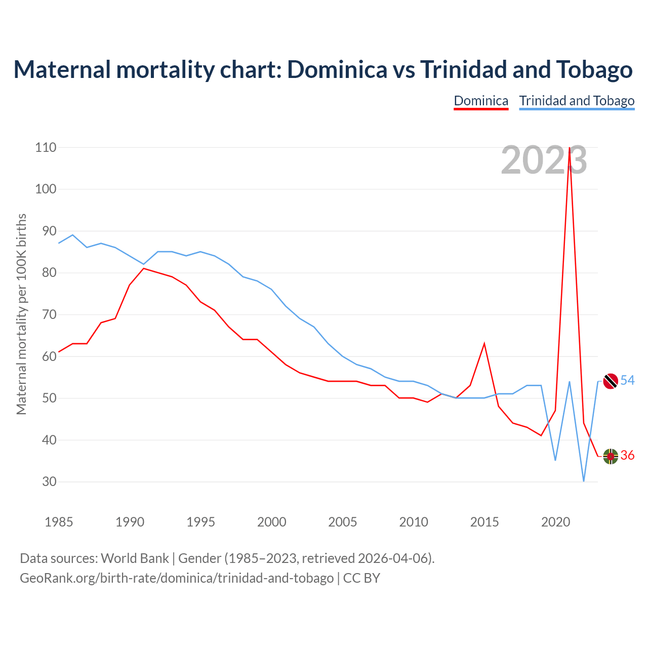 The maternal mortality rate, which is the probability of dying during childbirth or within 42 days of pregnancy termination, is 36 deaths per 100,000 live births in Dominica, compared to 54 deaths in Trinidad and Tobago.