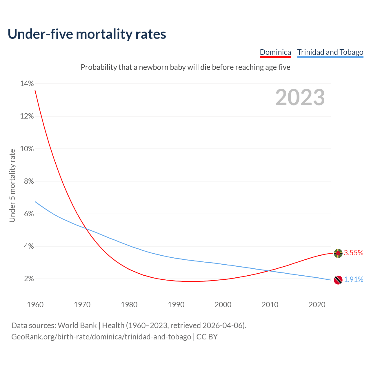 The chance that a newborn baby will die before reaching age five is 3.55% in Dominica and 1.91% in Trinidad and Tobago. Above is a chart with historical data on under-five mortality rates.