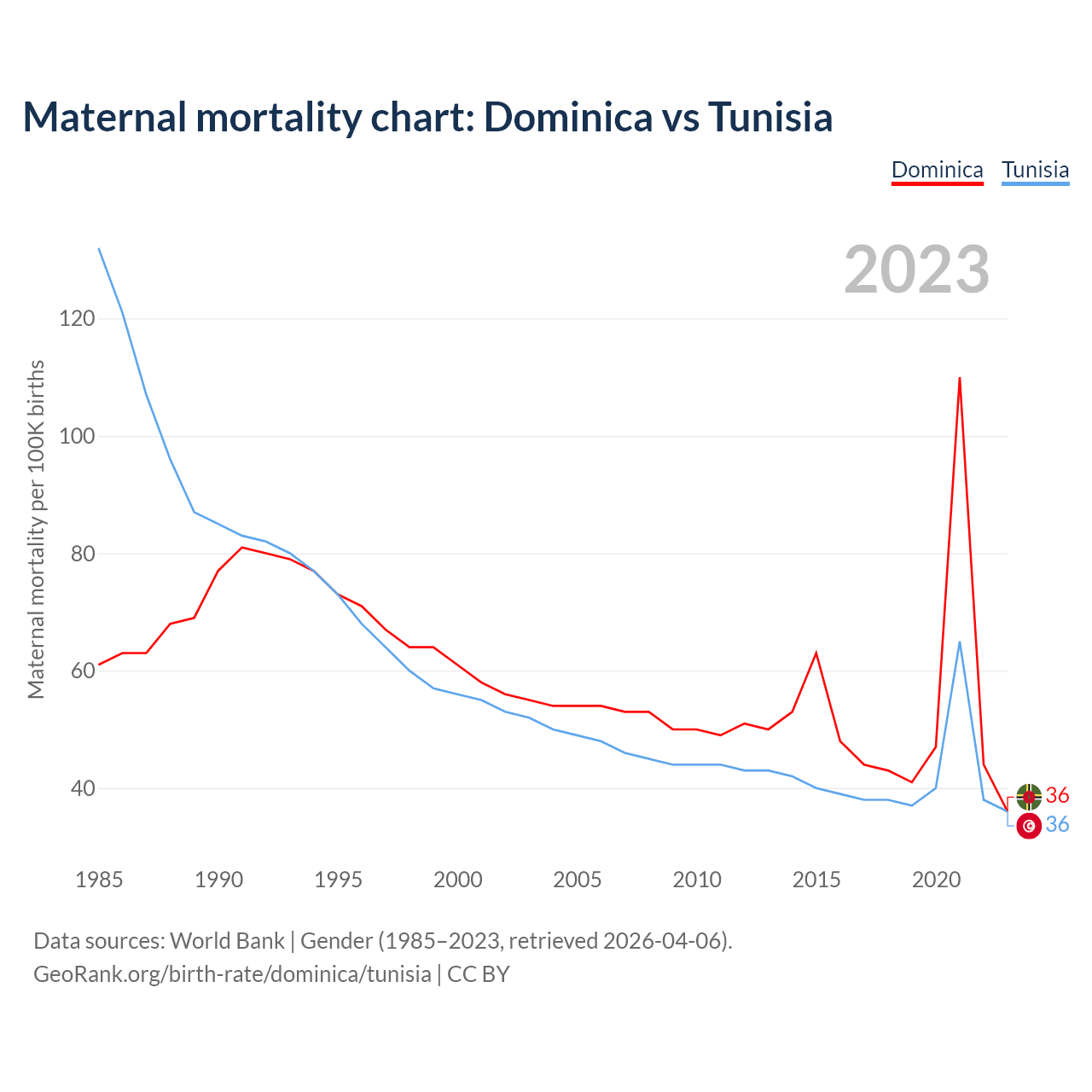 The maternal mortality rate, which is the probability of dying during childbirth or within 42 days of pregnancy termination, is 36 deaths per 100,000 live births in Dominica, compared to 36 deaths in Tunisia.