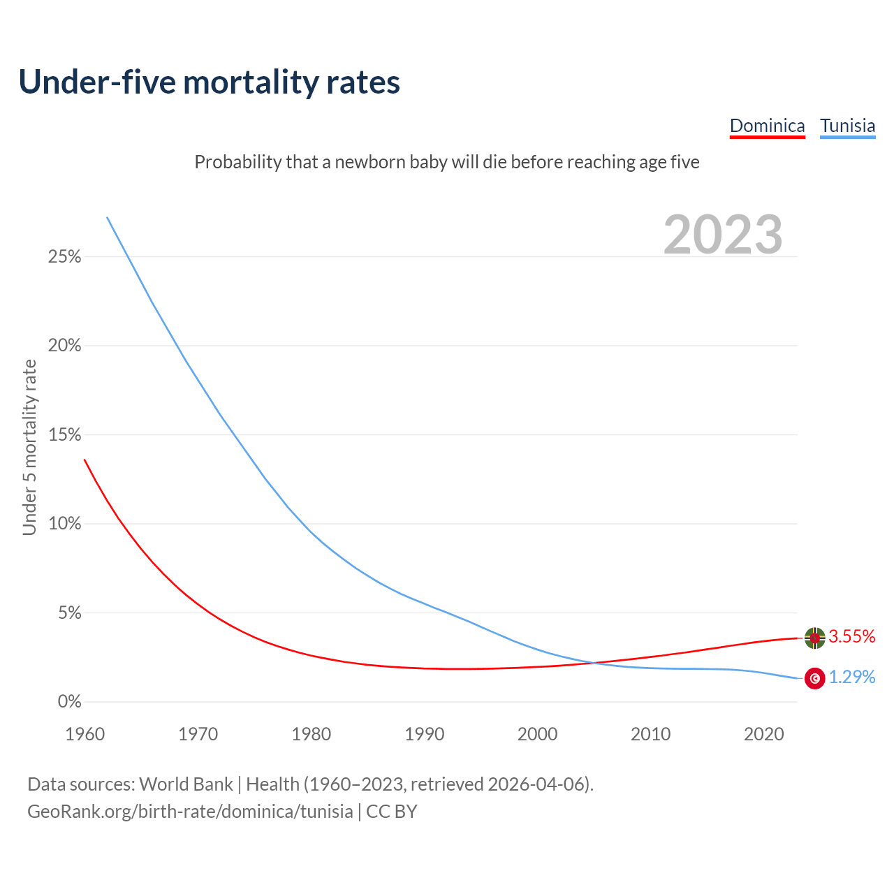 The chance that a newborn baby will die before reaching age five is 3.55% in Dominica and 1.29% in Tunisia. Above is a chart with historical data on under-five mortality rates.