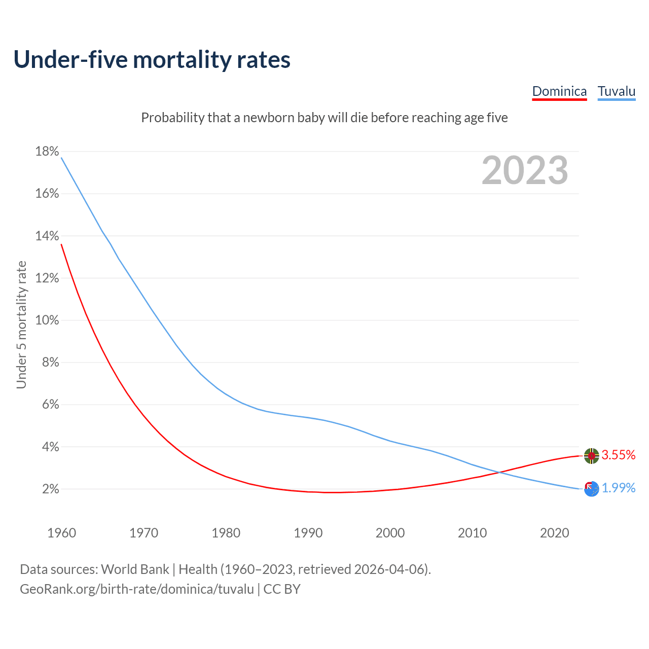 The chance that a newborn baby will die before reaching age five is 3.55% in Dominica and 1.99% in Tuvalu. Above is a chart with historical data on under-five mortality rates.