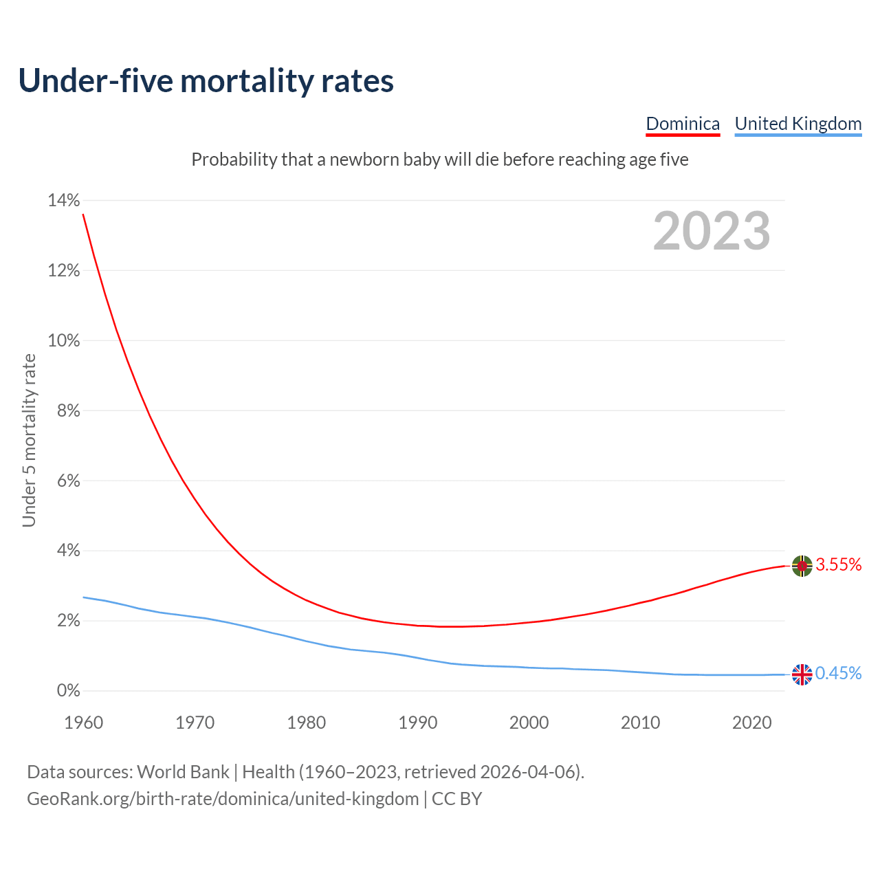 The chance that a newborn baby will die before reaching age five is 3.55% in Dominica and 0.45% in the United Kingdom. Above is a chart with historical data on under-five mortality rates.
